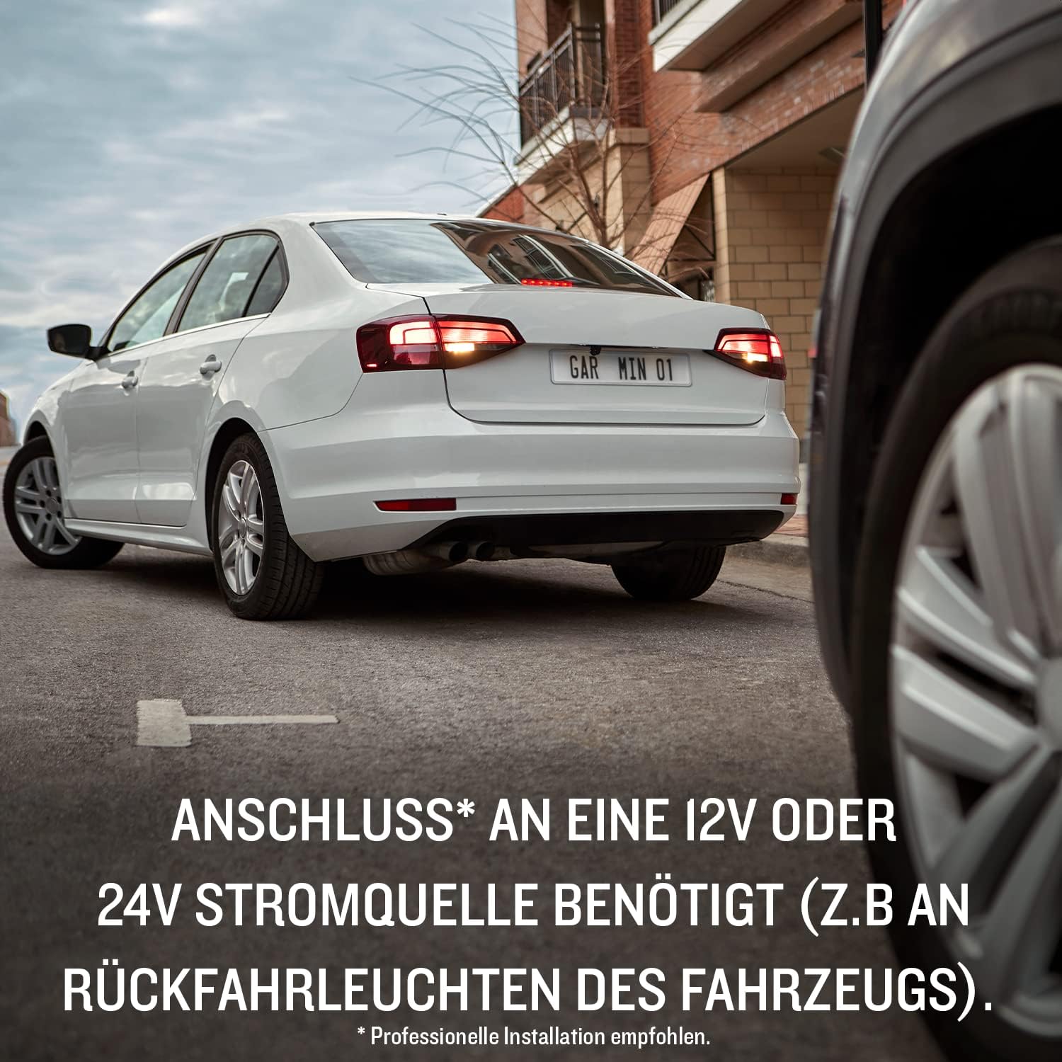 - STROMVERSORGUNG: Die Kamera benötigt den Anschluss an eine 12V oder 24V Stromquelle, wie z.B. das Rückfahrleuchten des Fahrzeugs. Die professionelle Installation am Kennzeichen über eine Fachkraft ist empfohlen