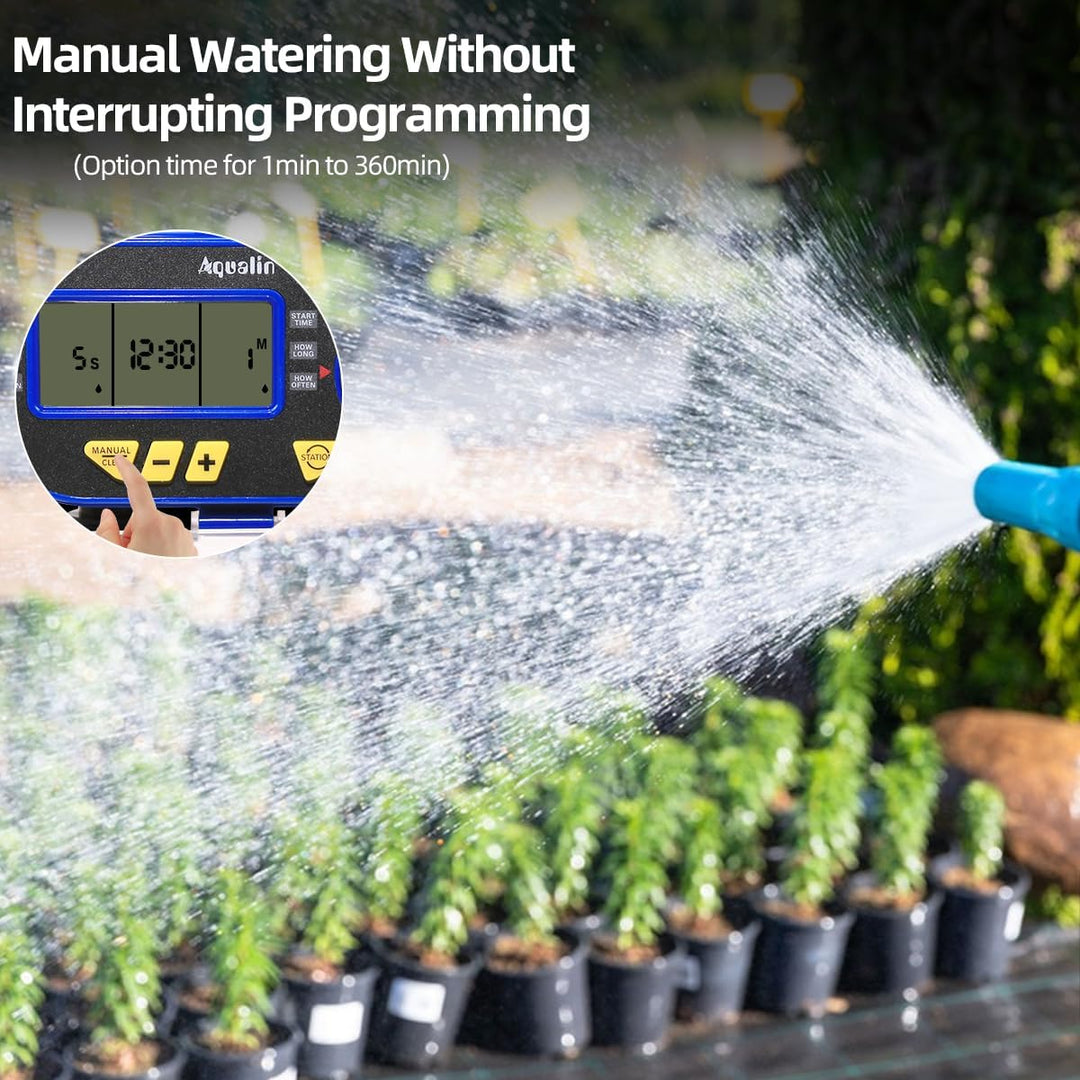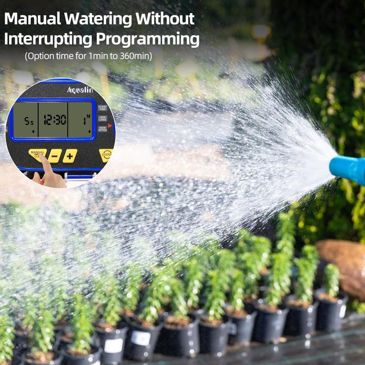 - Zwei programmierbare Auslässe - Zwei Ventile von dem Bewässerungscomputer können verschiedene Programm unabhängig laufen. Sie können zwei Schläuche mit der Bewässerunguhr verbinden