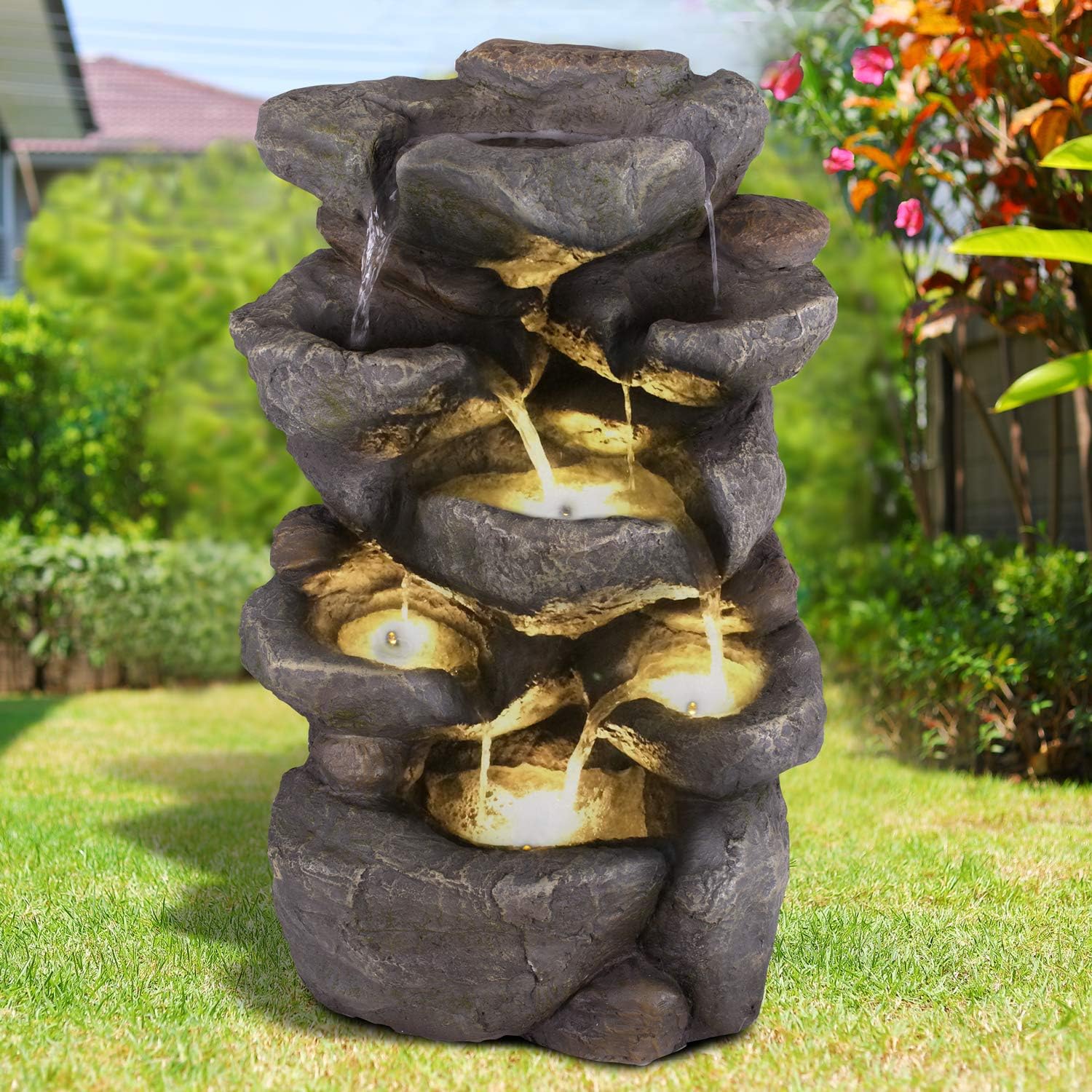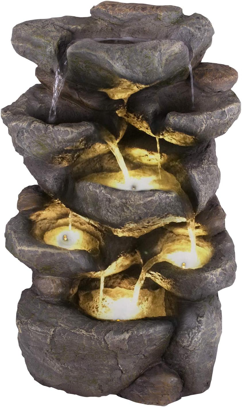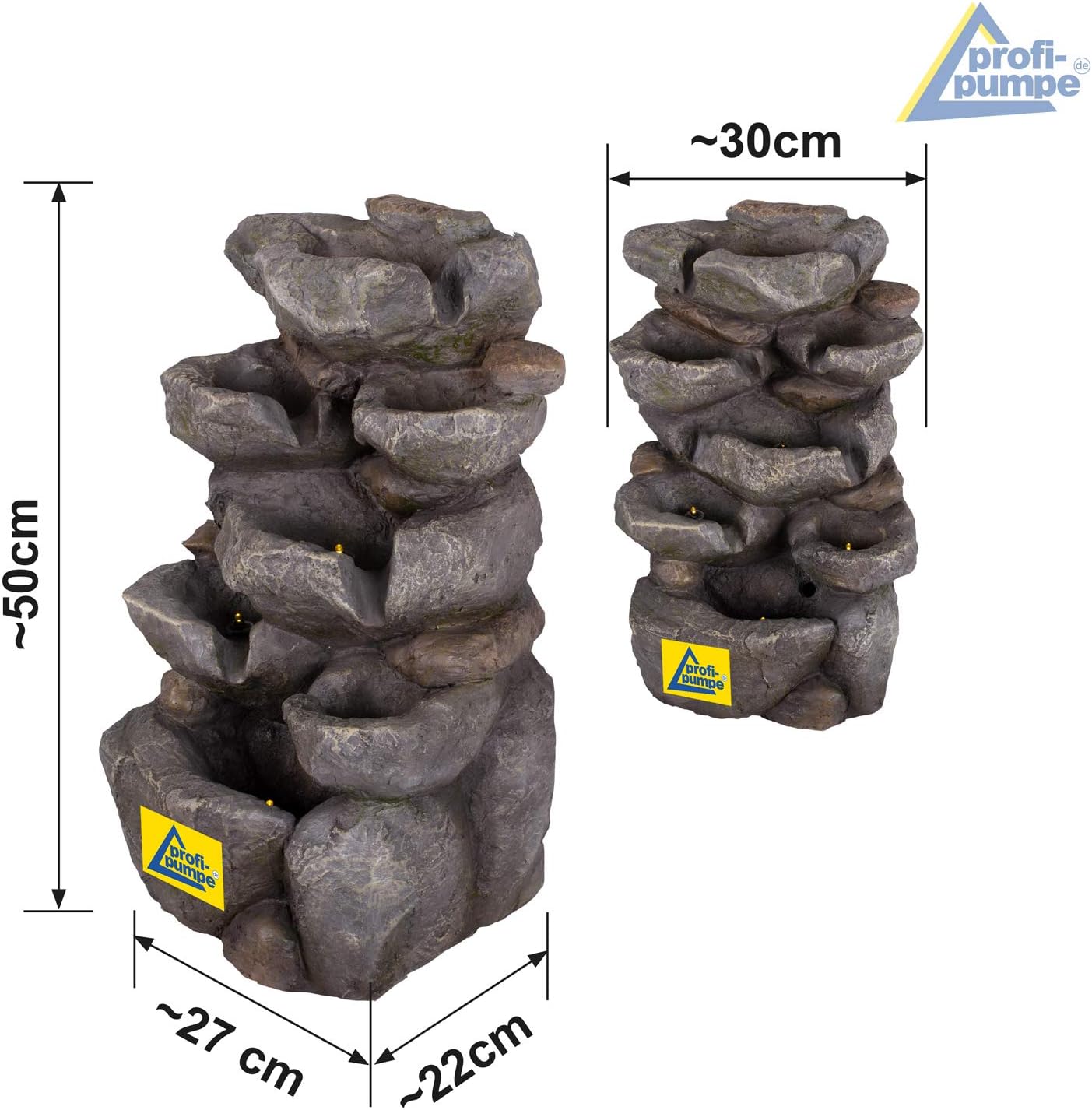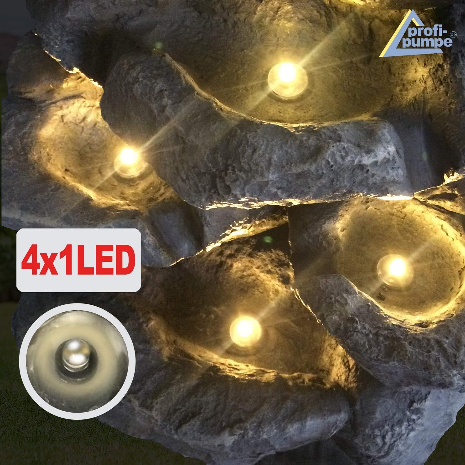 - Der Brunnen ist sowohl bei Tag als auch bei Nacht der perfekte Hingucker. Die mitgelieferte LED-Beleuchtung sorgt für die perfekte Illumination. Die LED-Lichter des austauschbaren LED-Rings erstrahlen in klassichem Weiss.