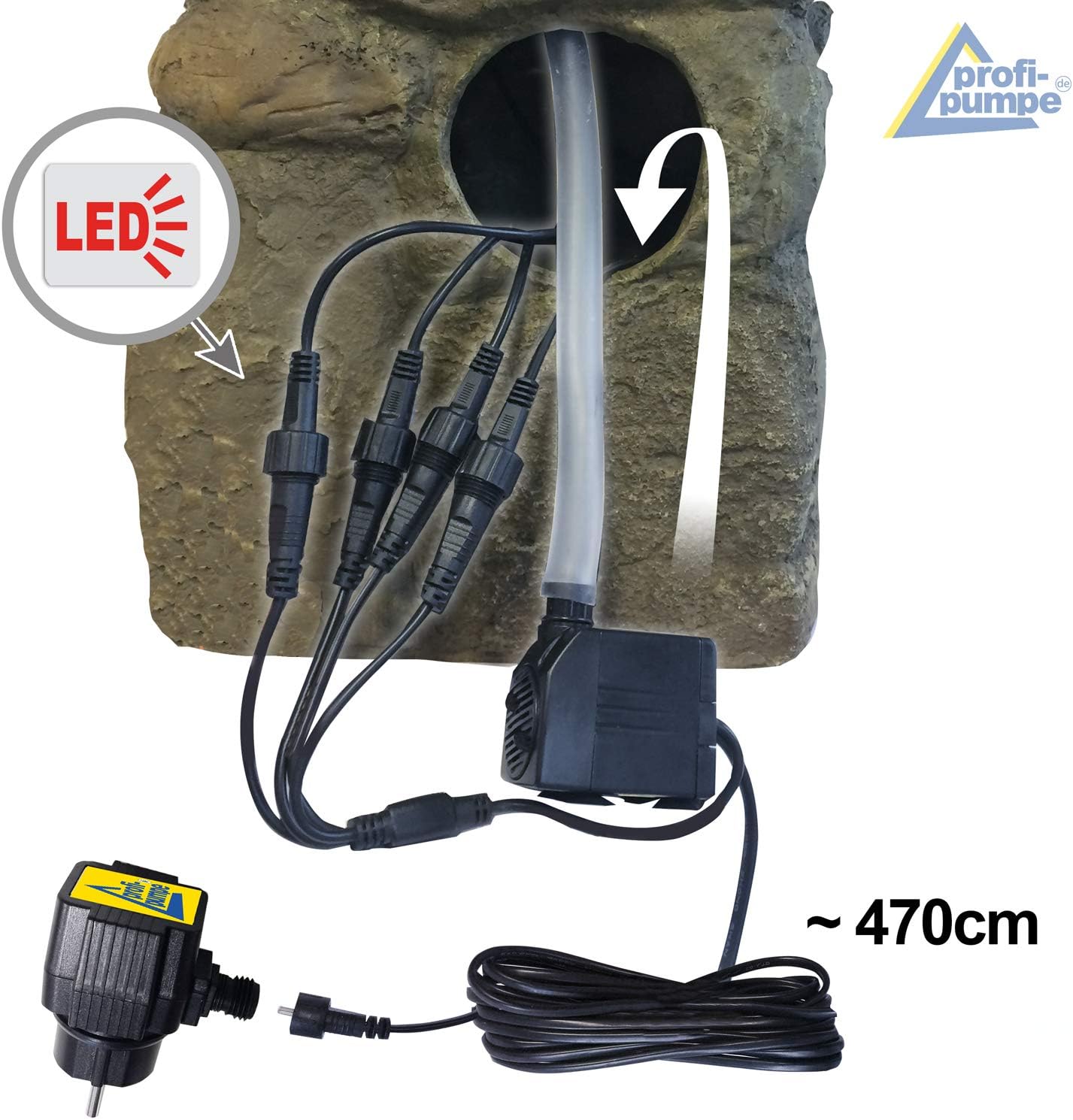 - Mit 230V/12V-Anschluss / Inkl. 7 Watt Pumpe / LED-Ring in warmem Weiss