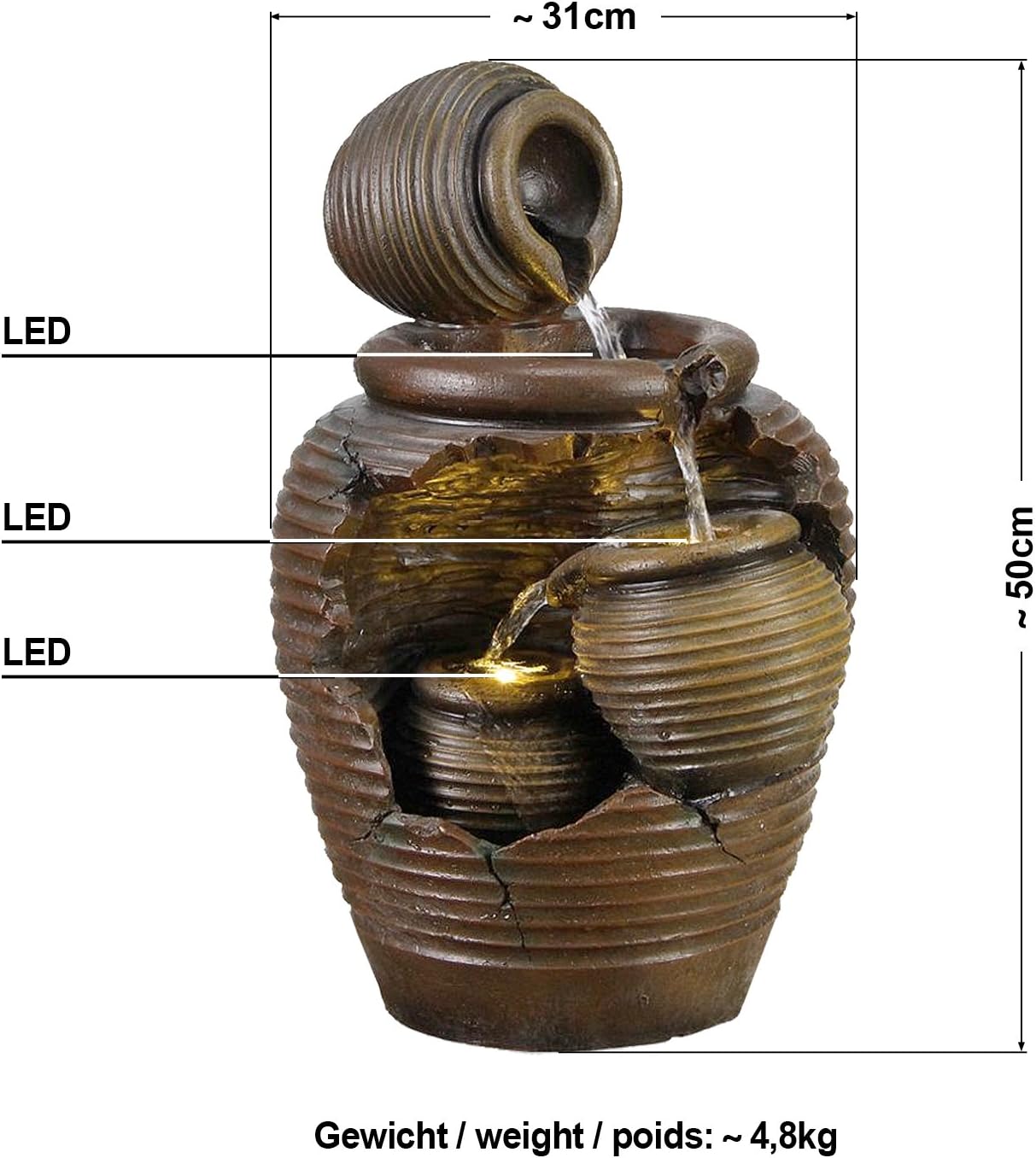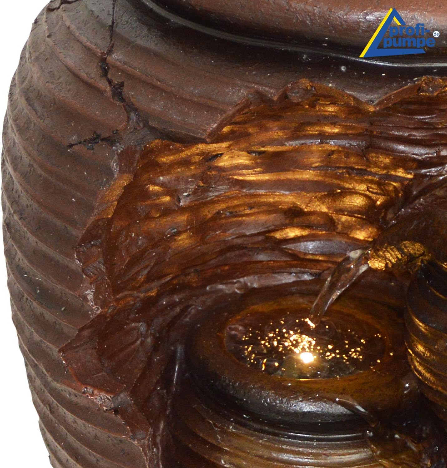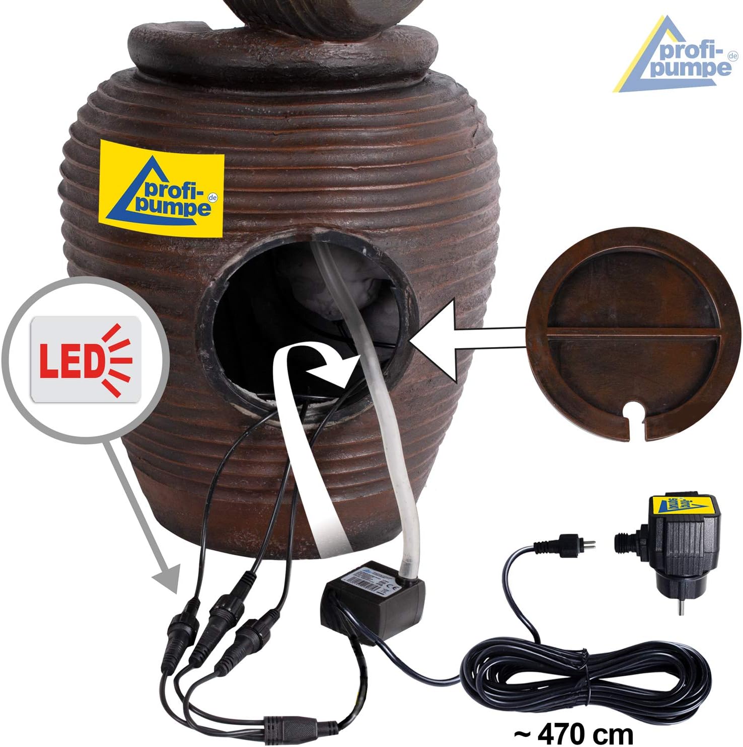 - Der Brunnen ist sowohl bei Tag als auch bei Nacht der perfekte Hingucker. Die mitgelieferte LED-Beleuchtung sorgt für die perfekte Illumination. Die LED-Lichter des austauschbaren LED-Rings erstrahlen in klassichem Weiss.