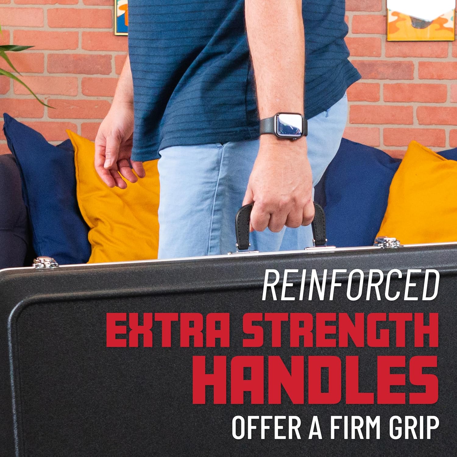 - Robuste Aluminiumklappen halten den Verschluss in einer Linie, schützen die Aussenkanten und verstärken die Gesamtstärke des Koffers.