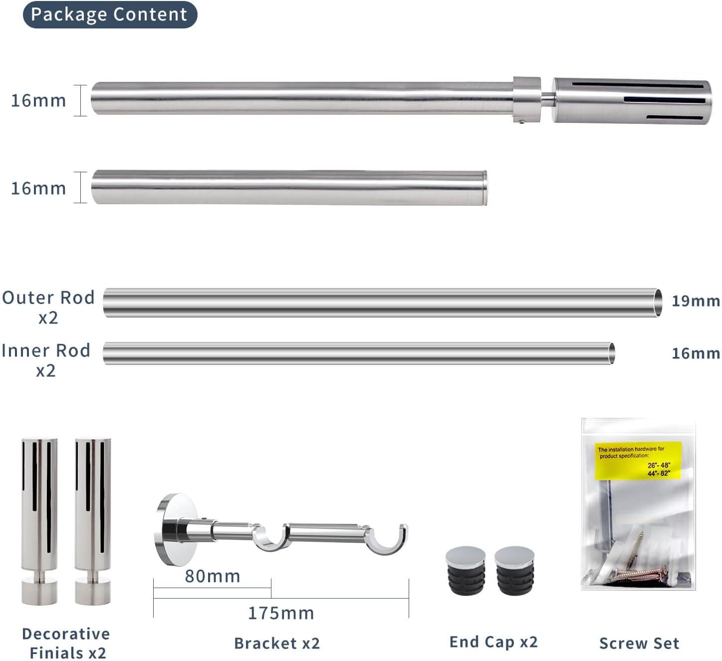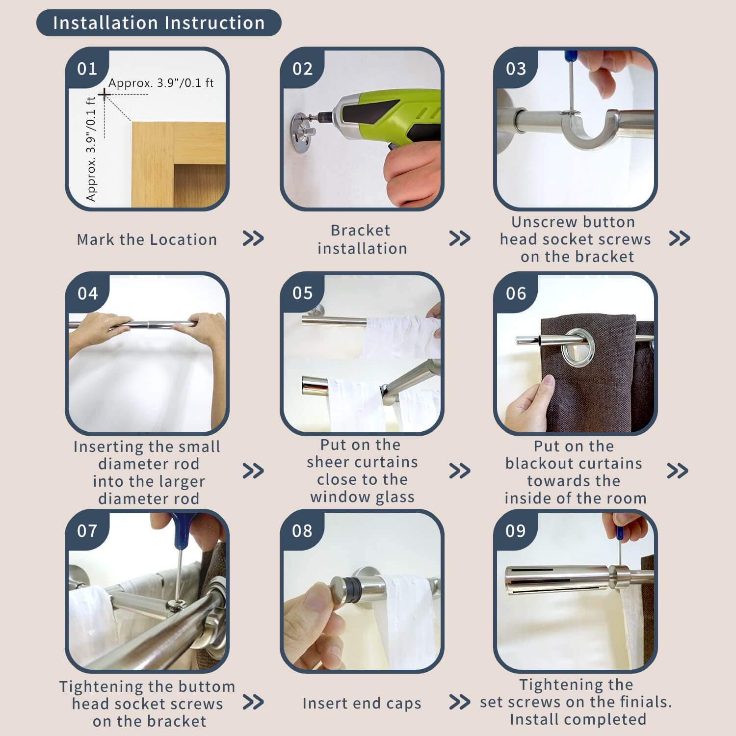 - Sowohl die vorderen als auch die hinteren Stangen haben einen Durchmesser von 5/8" - 3/4" (16-19 mm). Hält schwere Vorhänge bis zu 55 lbs.