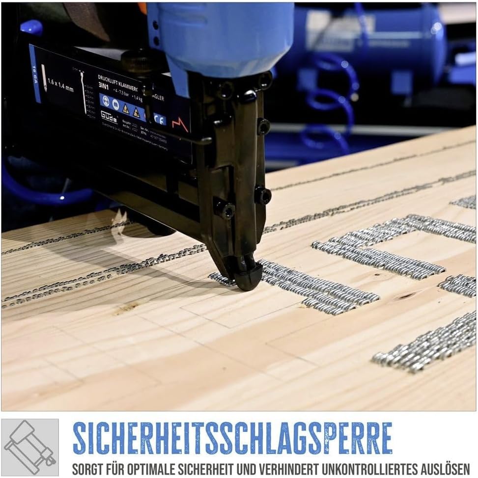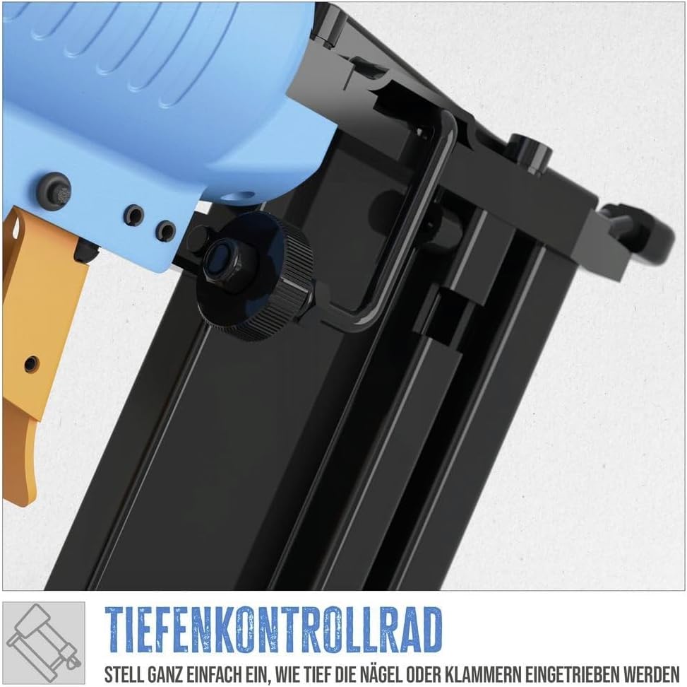 - Umfangreiches Zubehör: Enthalten ist ein Tragekoffer zum sichern Aufbewahren, eine Ölflasche, 2x Sechskantschlüssel, 200x Klammern 20 mm lang, 600x Nägel 25 mm lang