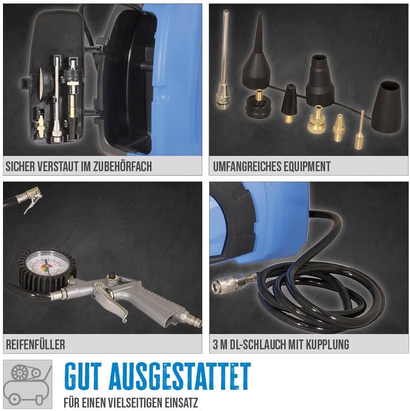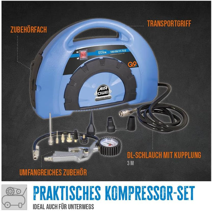 - ALL-IN-ONE-LÖSUNG: Vielseitiges Güde Kompressor-Kompakt-Set 180/08/11-tlg. für alle Ihre Druckluftbedürfnisse: Perfekt zum Prüfen und Aufpumpen von KFZ-, Motorrad- und Fahrradreifen sowie zum Aufblasen von Luftmatratzen und Schlauchbooten. Ein Set,