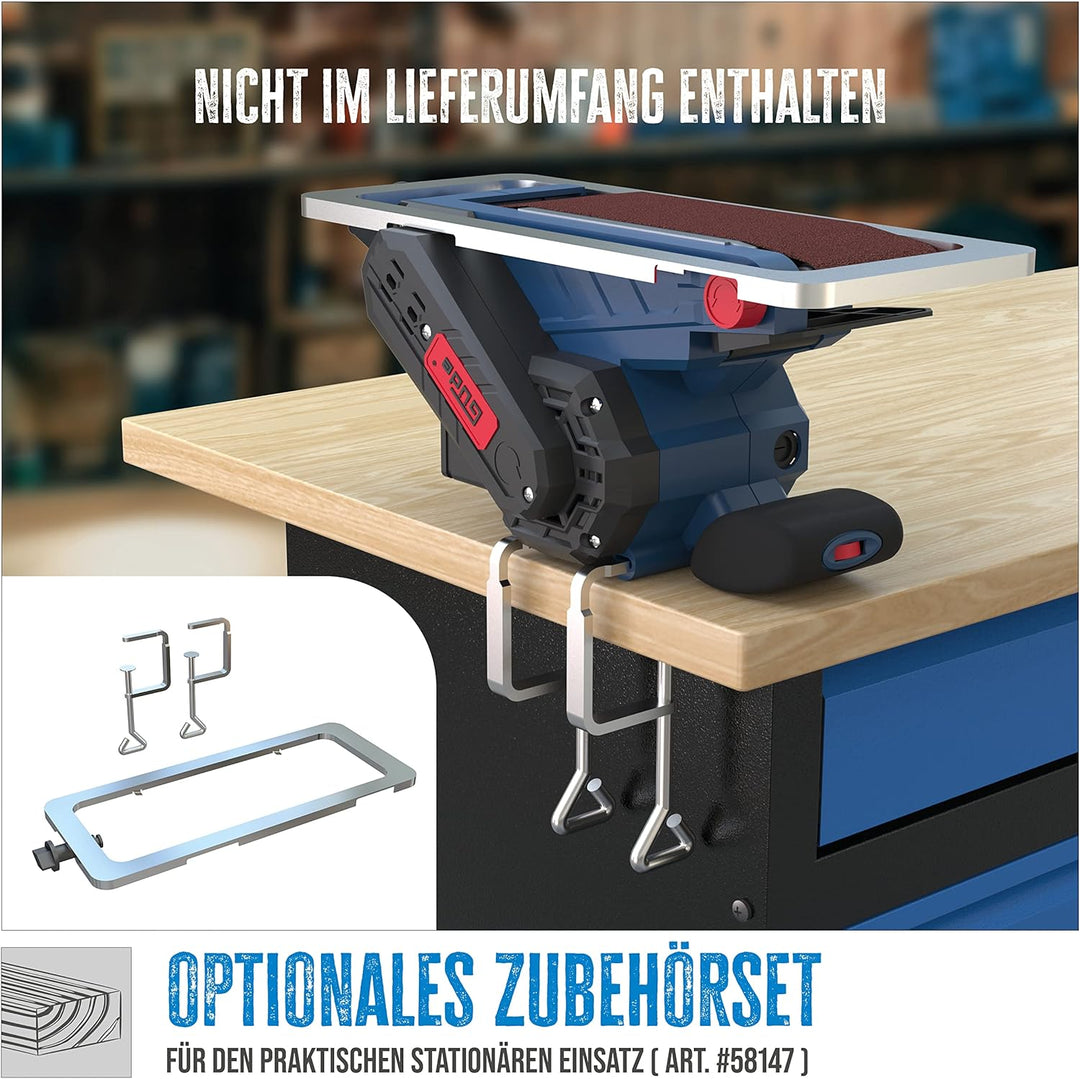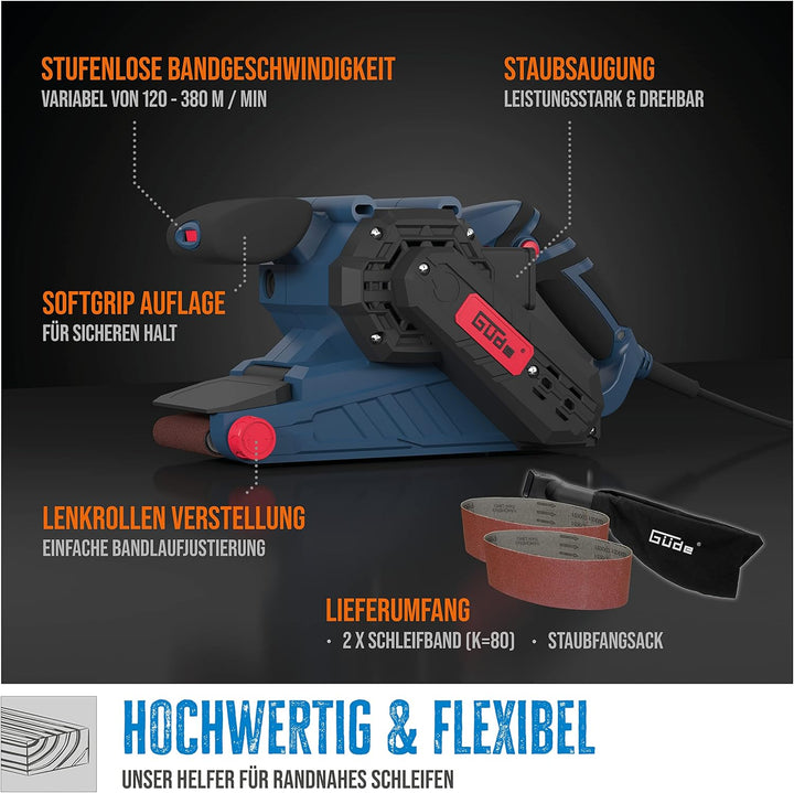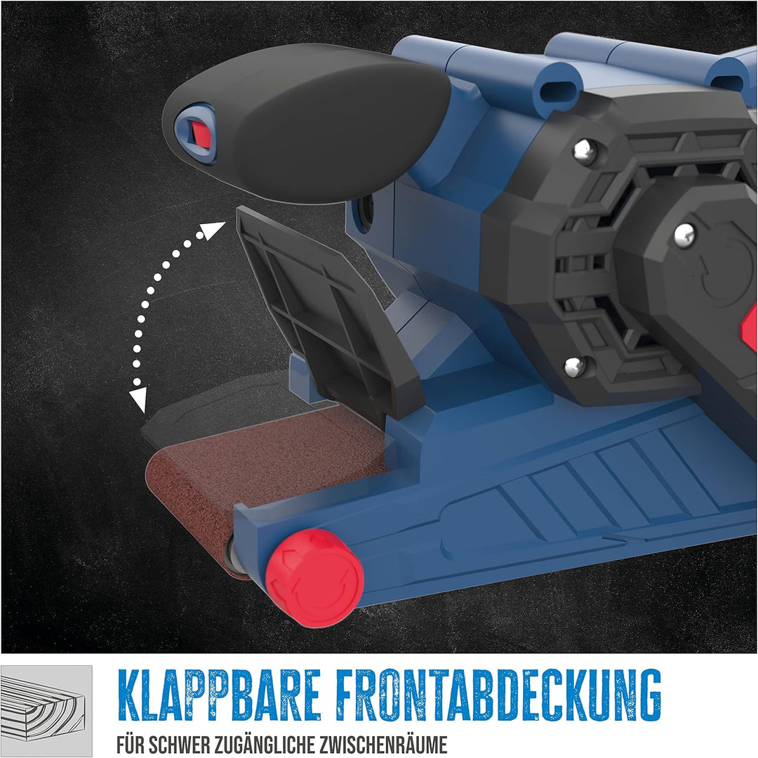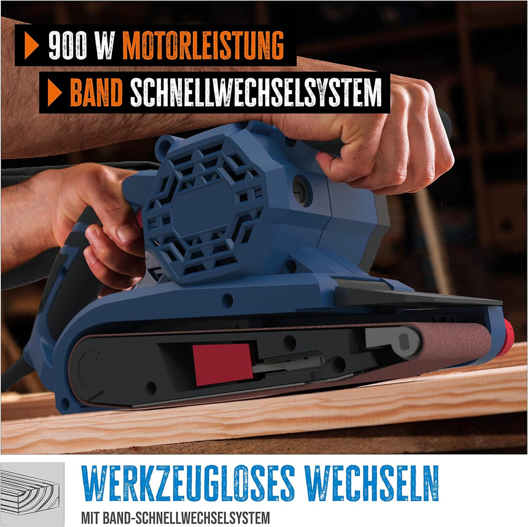 - Einfache Bandjustierung durch Einstellung der Lenkrollen, Bandschnellwechselsystem
