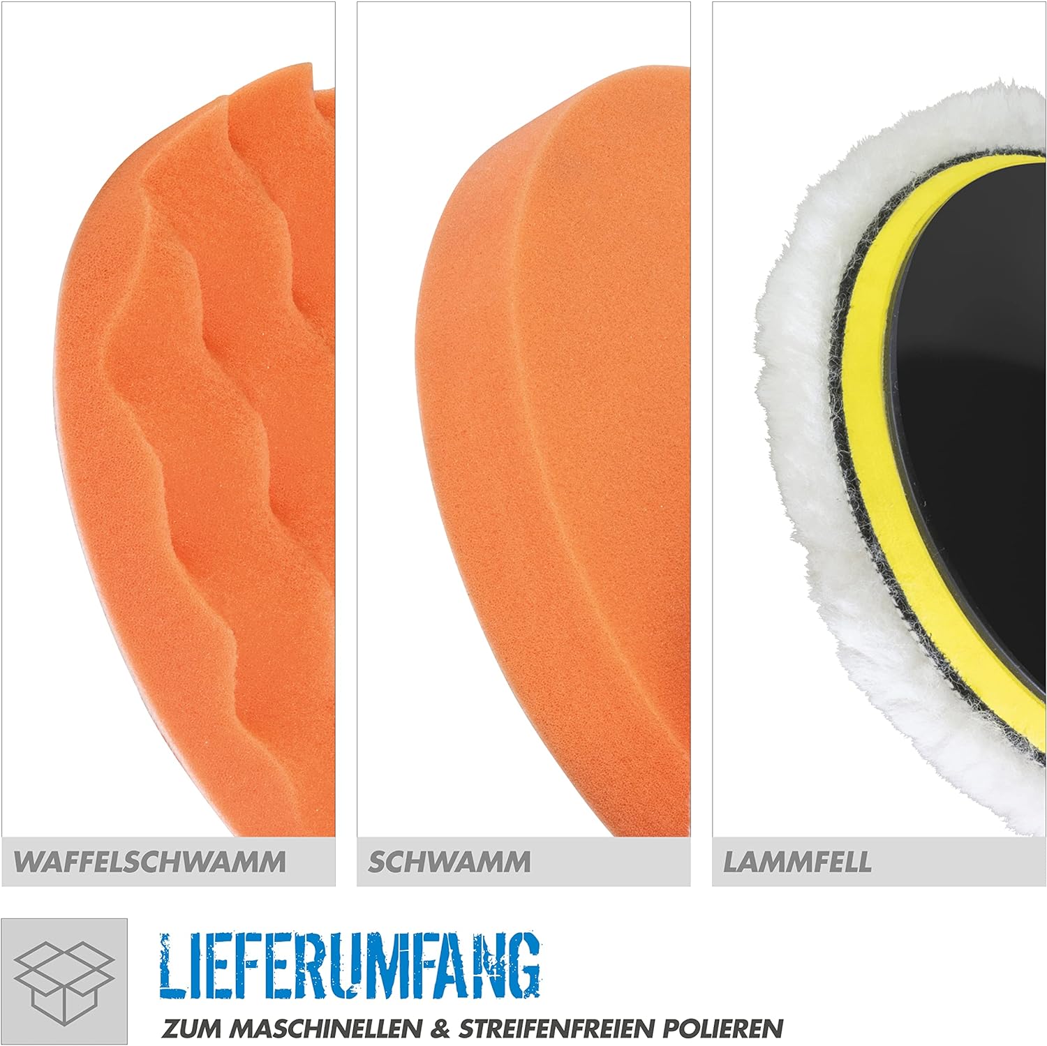 - LIEFERUMFANG - Bereits im Lieferumfang der Poliermaschine enthalten sind 3 Polierhauben (Lammfell, Schwamm, Waffelschwamm)