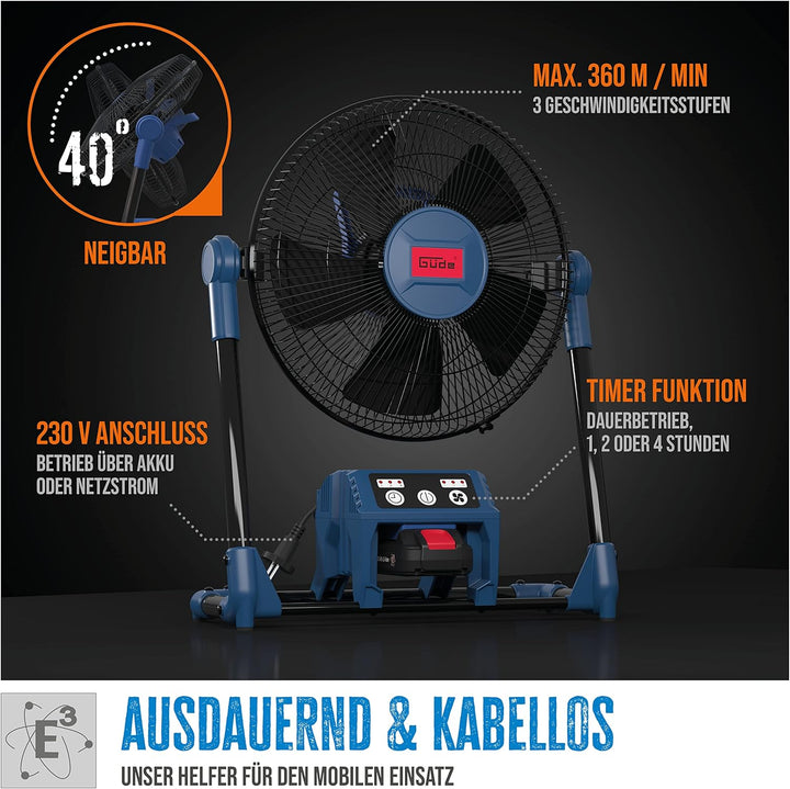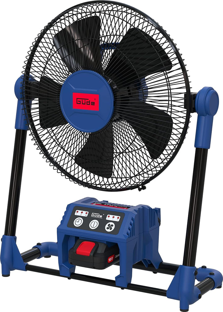 - LEISTUNGSSTARK: Der Güde Akku Ventilator V 18-201-05 aus der 18V E³ Akkusystem-Gruppe bietet 3 einstellbare Windgeschwindigkeiten bis zu einer max. Luftgeschwindigkeit von 360 m/min für den Einsatz in Haus und Werkstatt.