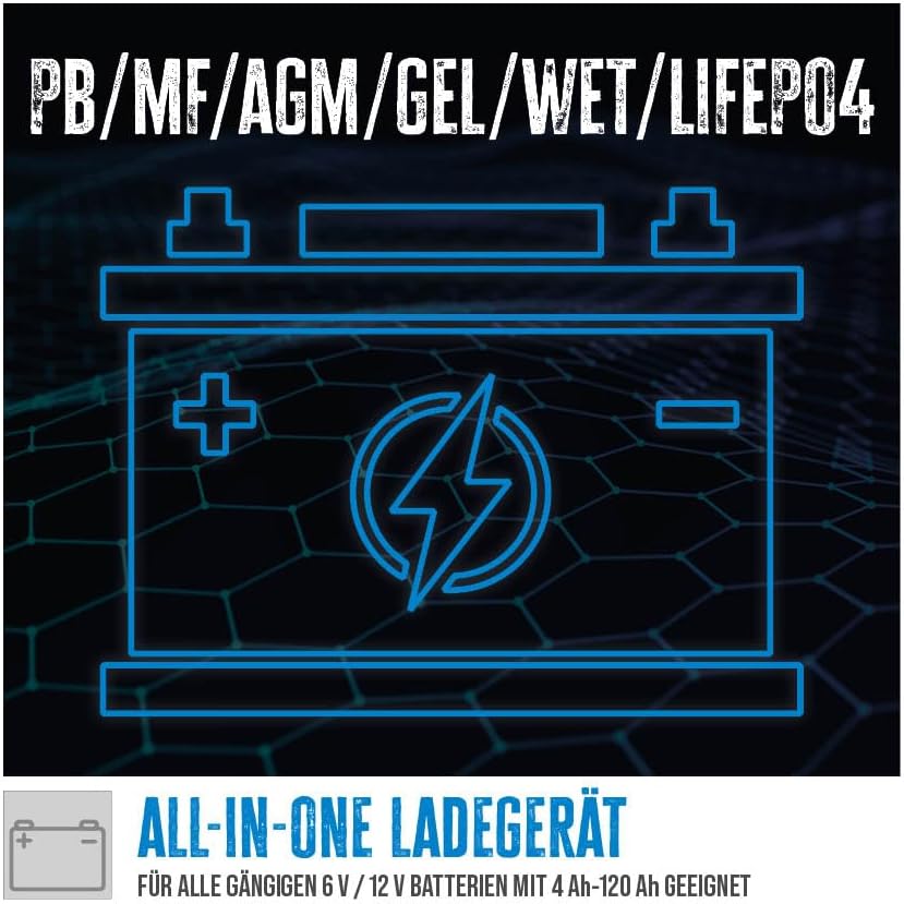 - PRAKTISCHES DESIGN: Das kompakte Gerät ist mit einer praktischen Öse zum Aufhängen ausgestattet und unterstützt unterschiedliche Batteriearten: PB, GEL, AGM, WET, LiFePO4