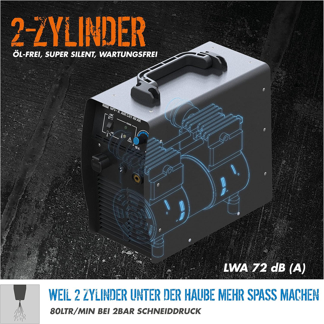 - SOFORT EINSATZBEREIT - Durch den integrierten Kompressor mit einem Druck von 2 bar und einer Liefermenge von 80 l/min. wird kein separater Kompressor benötigt.