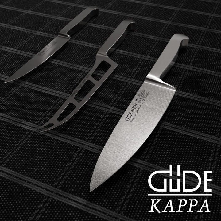 - Die KAPPA Serie von GÜDE ist im wahrsten Sinne des Wortes, aus einem Stück Stahl geschmiedet worden. Kein Einsatz von weiteren Komponenten, nur ein Stück Stahl. Noch spürbarer und näher, kann die Schmiedekunst aus Solingen nicht gebracht werden
