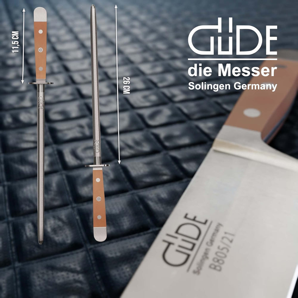 - Als einer der letzten deutschen Messerhersteller setzt GÜDE auf perfekte Handarbeit. Der Wetzstab ist aus legiertem Werkzeugstahl (Chrom-Vanadium), rostfrei und hartverchromt.