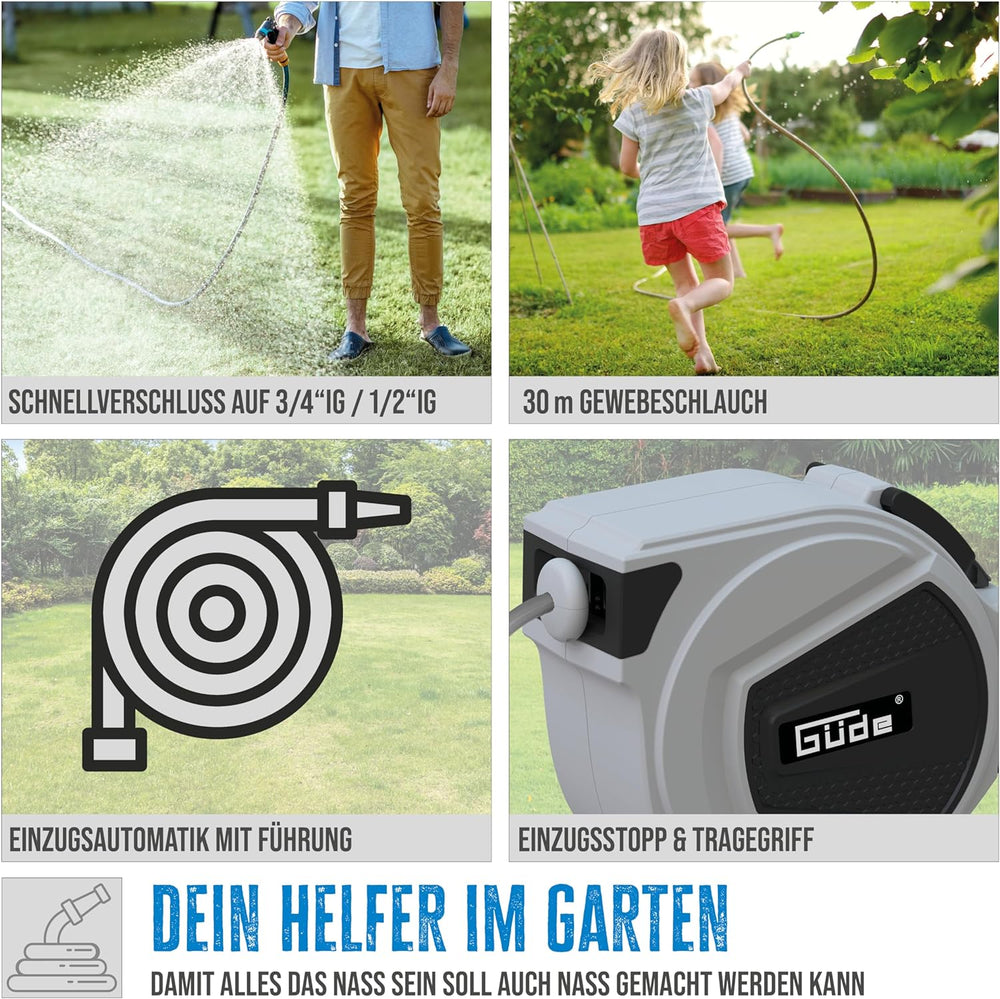 - Schlauchtrommel mit automatischer Einzugsautomatik mit Lagenaufwicklung