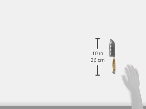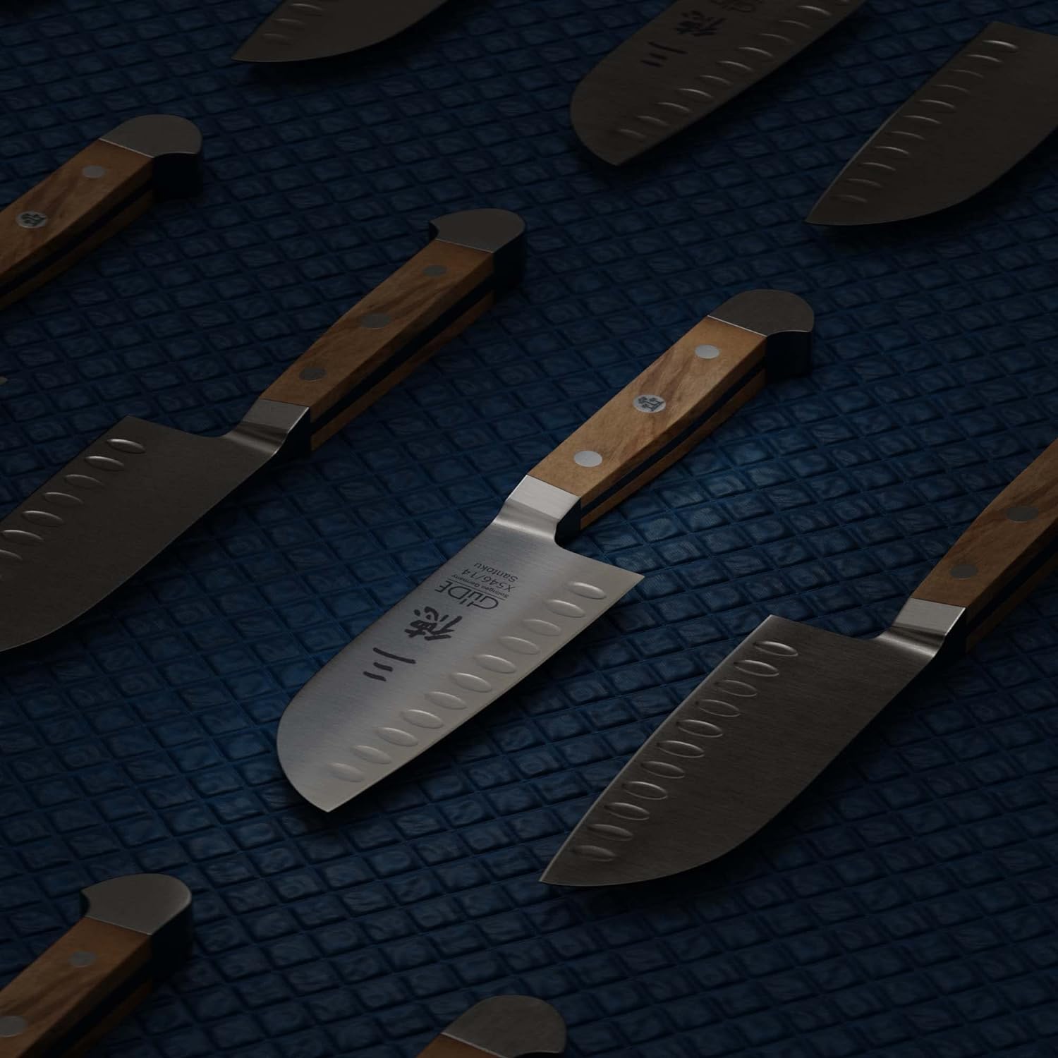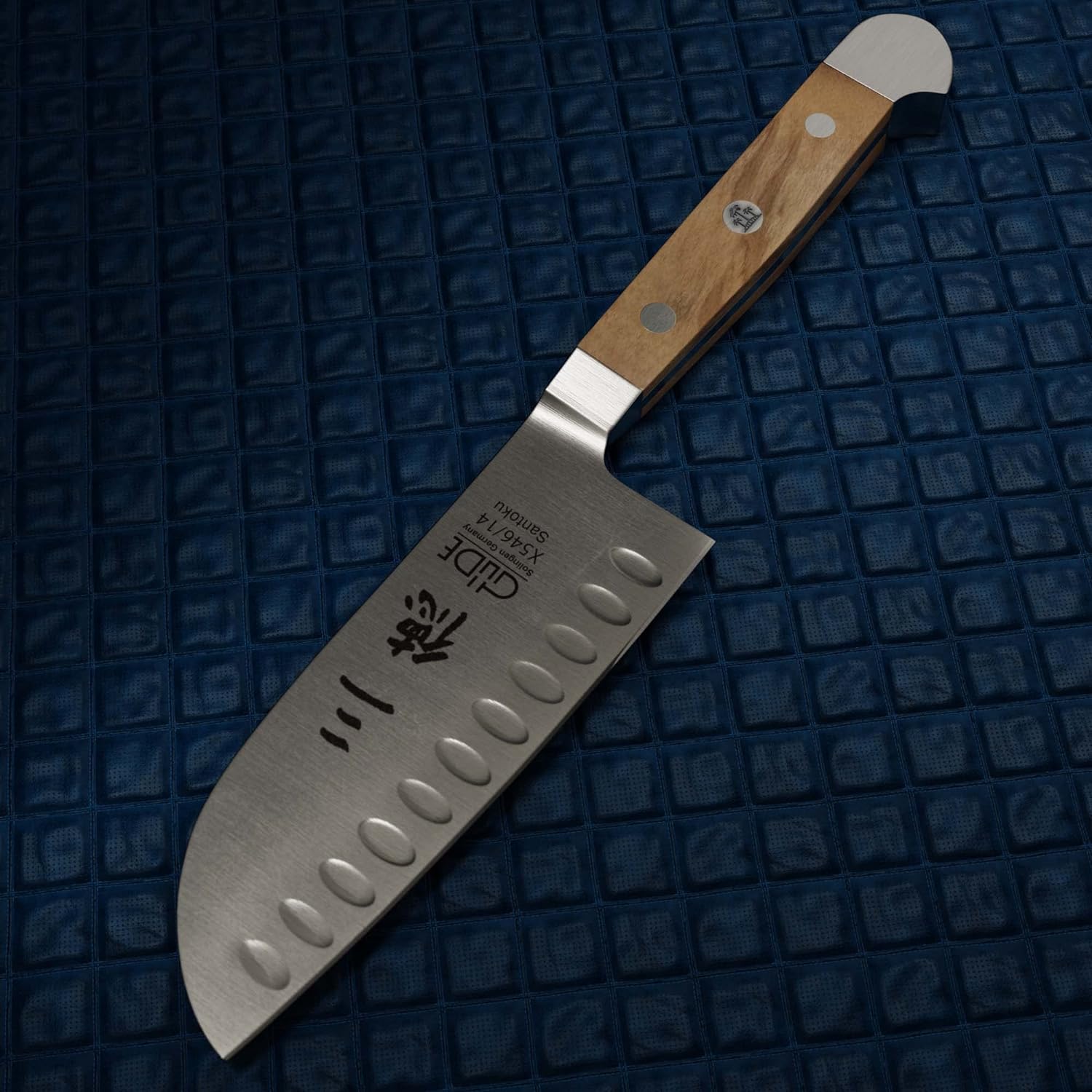 - Eine von oben nach unten laufenden dünne Klinge mit einer speziellen Klingenform, zeichnet das Santoku Messer aus. Das japanische Kochmesser wurde für Fisch, Fleisch und Gemüse konzipiert. Der Kullenschliff verhindert das Anhaften des Schneidguts
