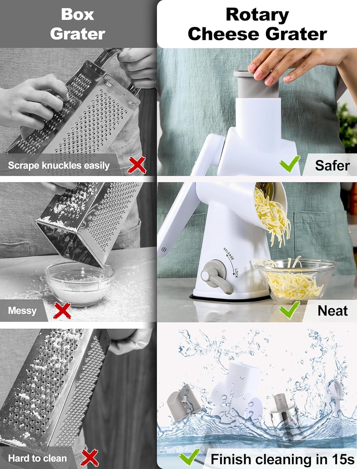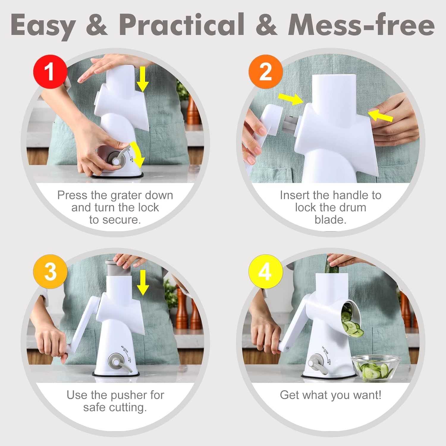 - 🧀 Einfach zu installieren und zu reinigen: Ausgestattet mit weniger abnehmbaren Teilen ist die Rotationsreibe einfach zu installieren und zu demontieren, was die Reinigung mit fliessendem Wasser in 15 Sekunden erleichtert. Die rotierende Käsereibe
