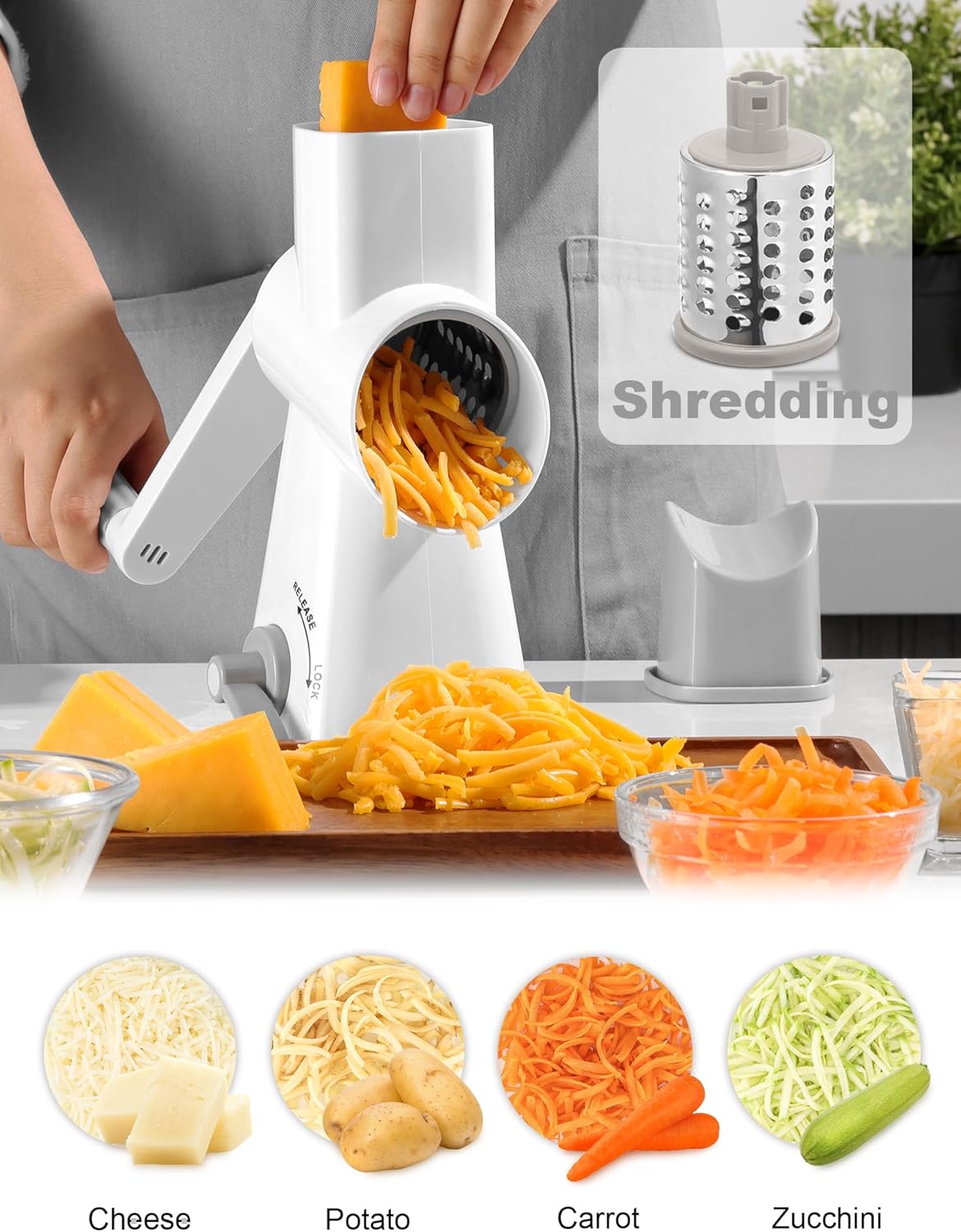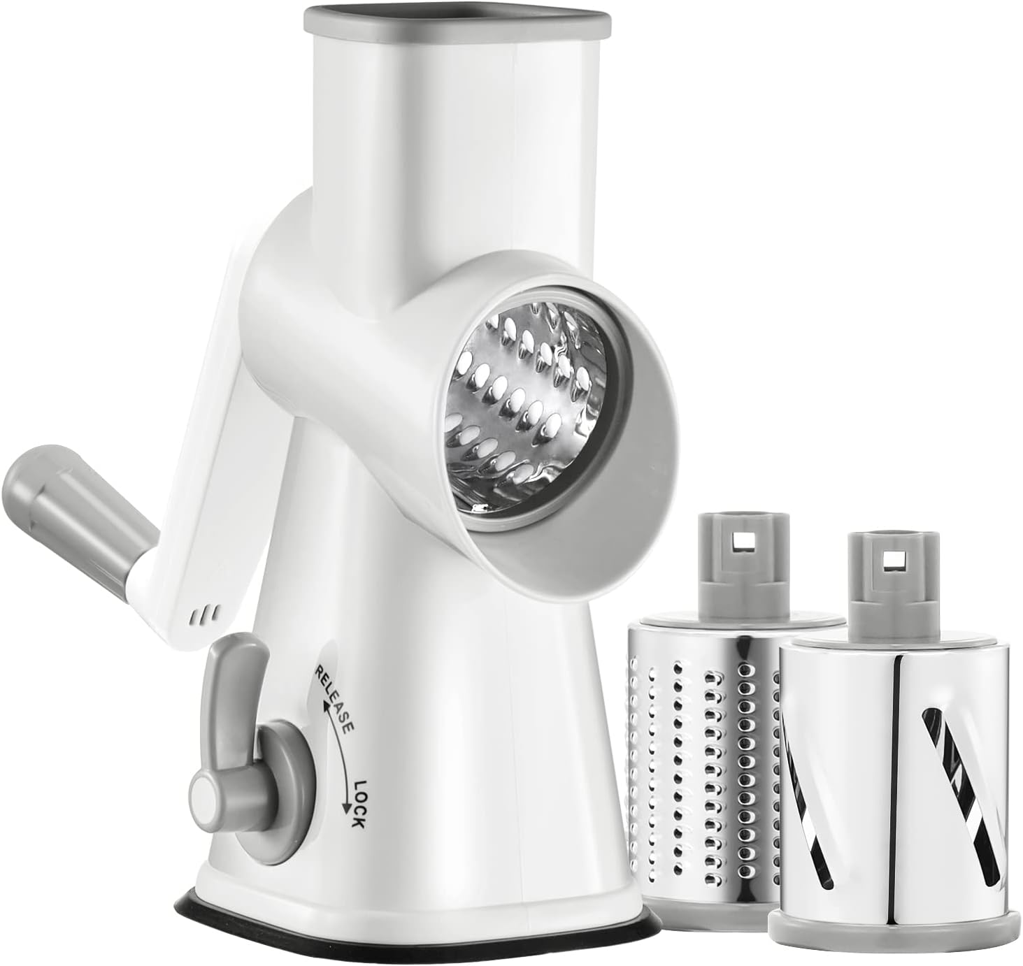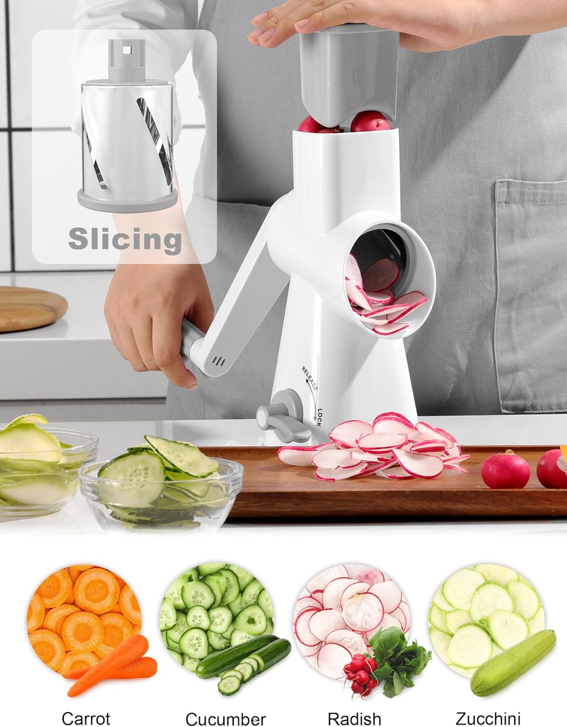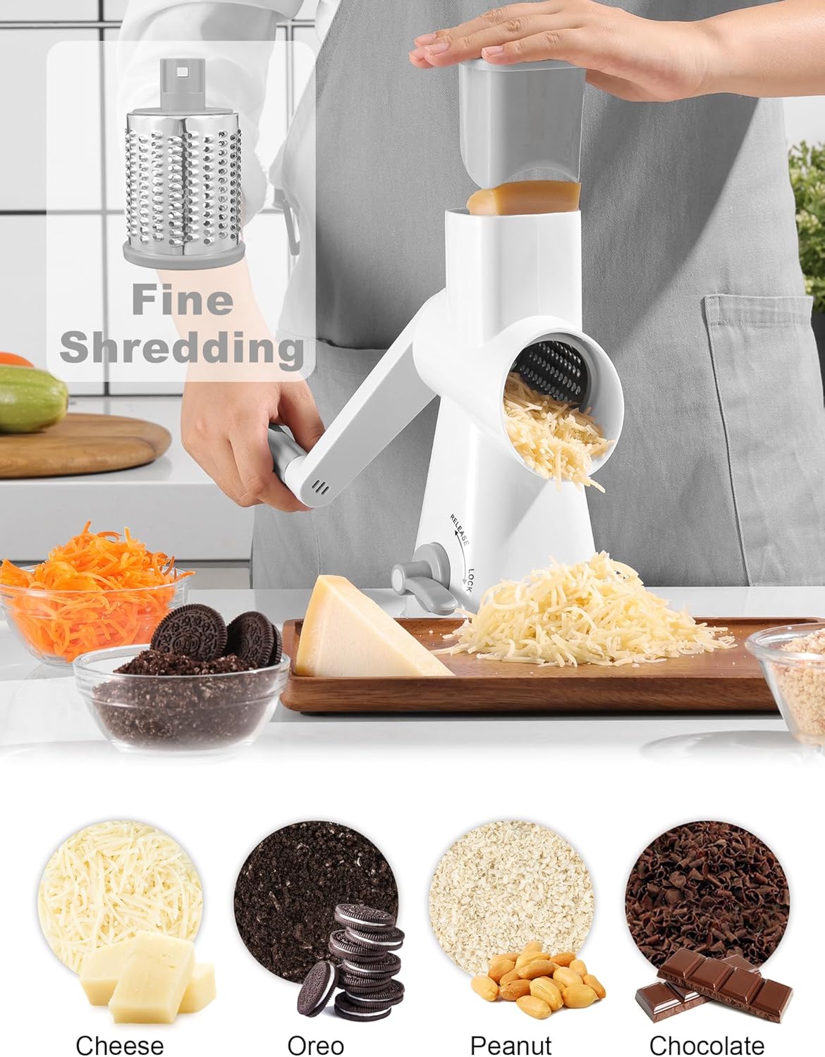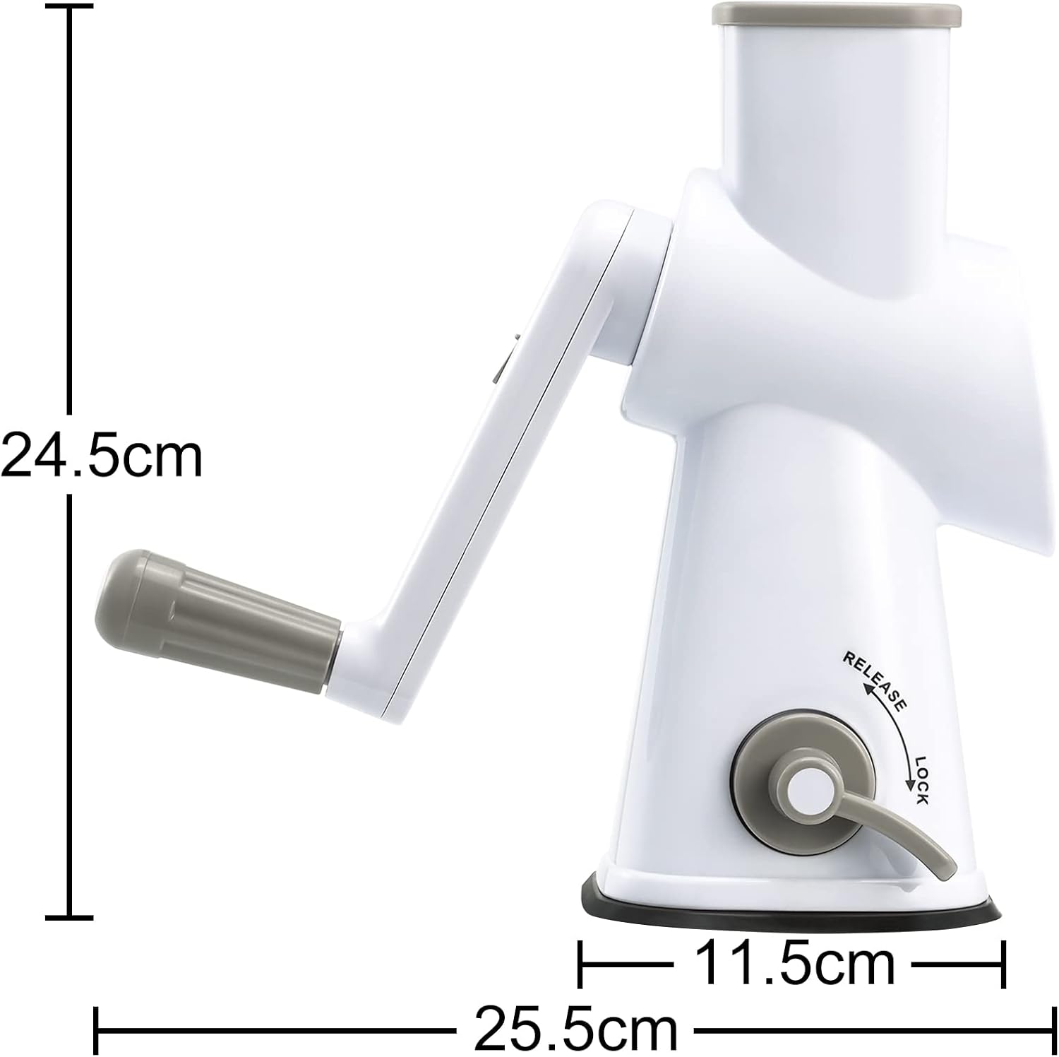 - 🧀Multifunktionale Gemüsereibe: Die manuelle Reibe für die Küche ist mit drei Trommelklingen ausgestattet, die Lebensmittel schneiden, zerkleinern und mahlen können. Es ist definitiv ein guter Helfer bei der Zubereitung vieler Speisen wie Gurken,