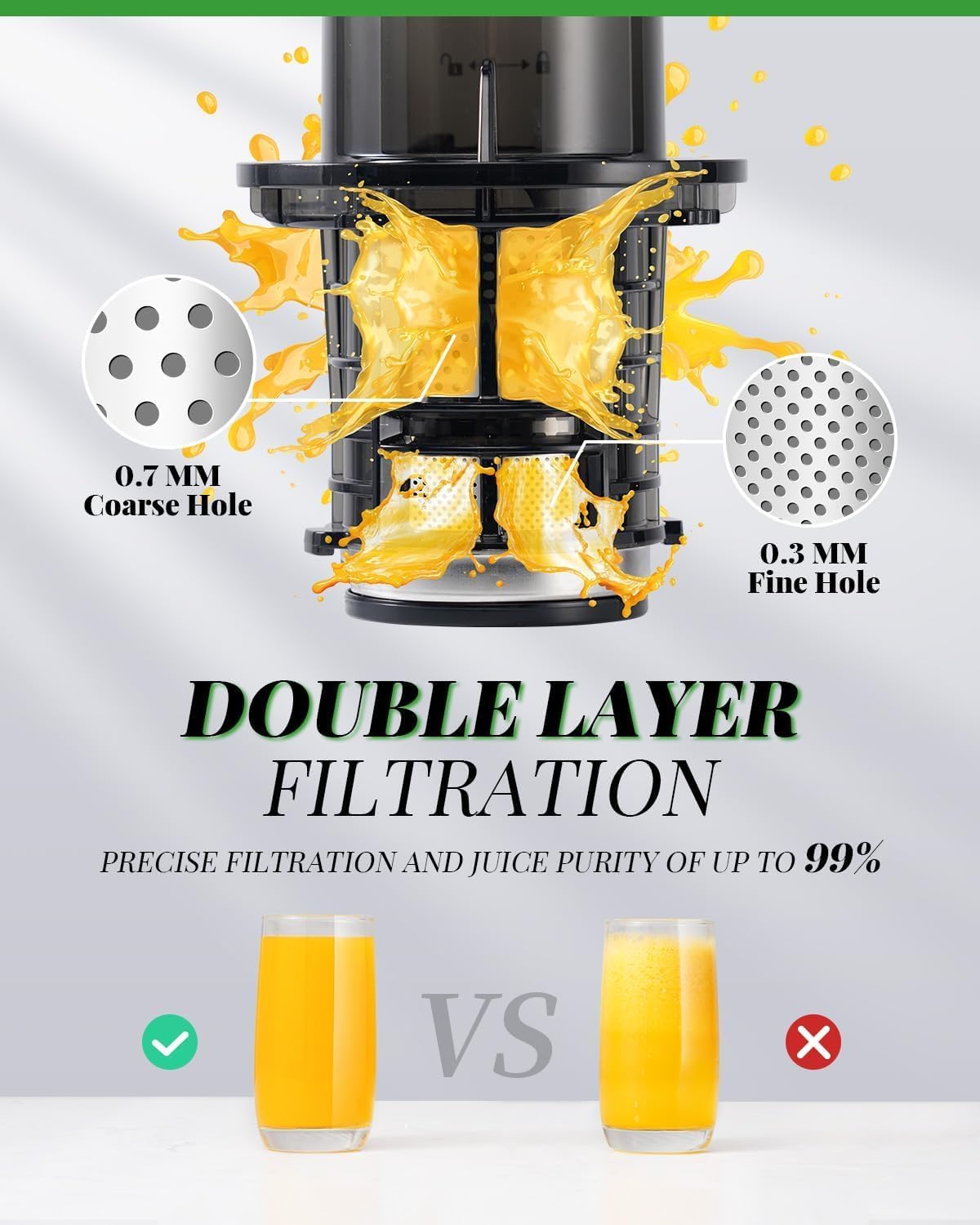 - Doppelte Filtration für reineren Saft: Juicer mit doppelfiltrationstechnologie trennt den trester perfekt vom saft, ermöglicht reinen saft und stellt sicher, dass Ihr saft klar und frei von fruchtfleisch ist. Macht ihn geschmeidiger und angenehmer zu