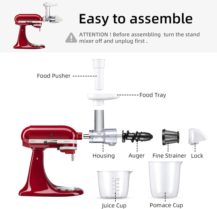 - 🍇【Bequem und kreativ】 Einfach in 1 Minute zu montieren oder zu demontieren. Befestigen Sie einfach den Kau-Entsafter-Aufsatz am Power-Hub einer beliebigen KitchenAid Küchenmaschine. Geben Sie dann das geschnittene Obst und Gemüse in das