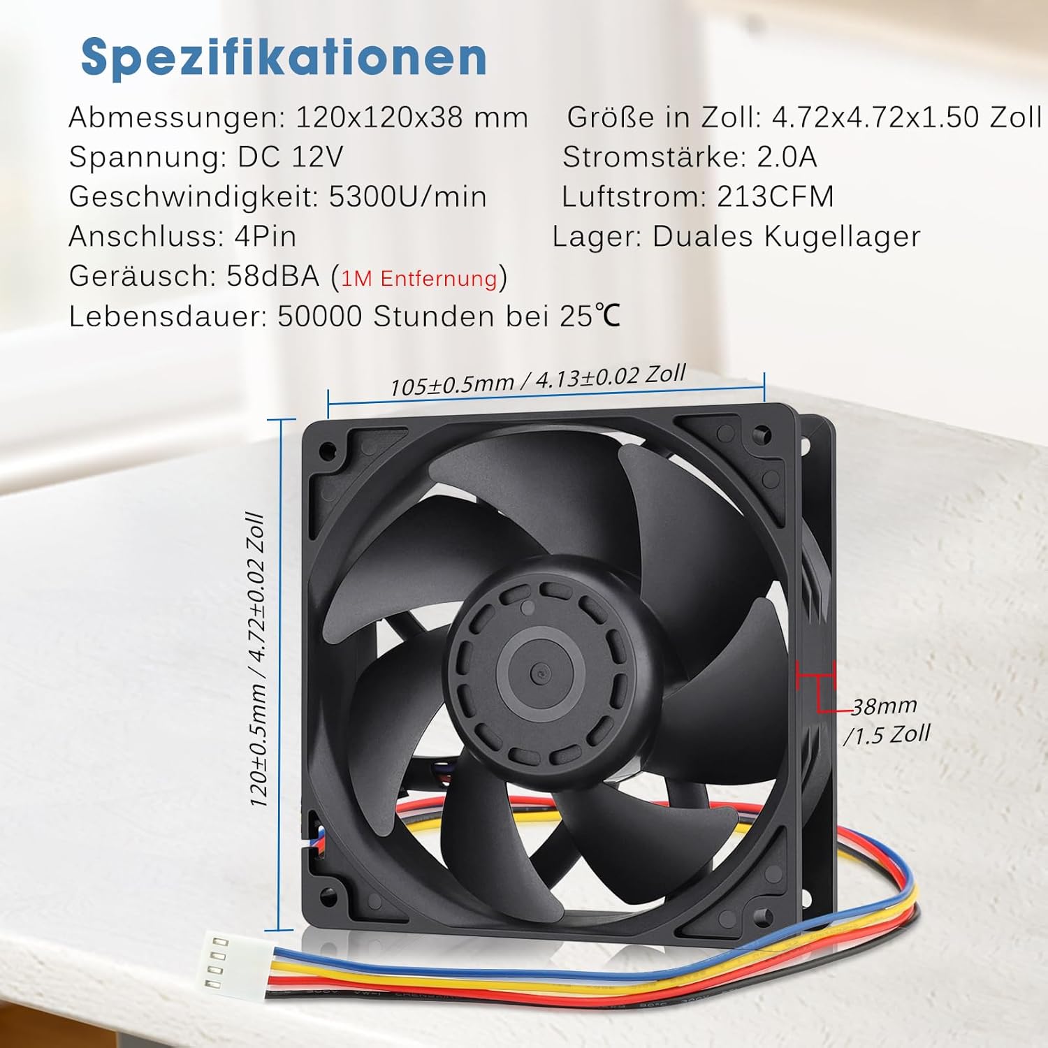 - echnische Daten: 120 x 120 x 38 mm; Stromspannung: DC 12V; Geschwindigkeit: 5300 U / min; Luftstrom: 213 FM; Material: PBT-Kunststoff-Lüfterrahmen und Flügel; Lebensdauer: 50.000 Stunden bei 25 ° C; Anschluss: 4Pin; Rauschen: 58 dBA;