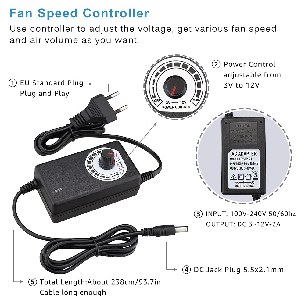 - Bieten Sie einen 3V-12V Lüfter Geschwindigkeit Kontrolle, Wenn Sie unterschiedliche Spannung einstellen, erhalten Sie verschiedene Luftstrom und Geräuschpegel . Die AC Lüfter geschwindigkeit Kontrolle ist bis zu 238 cm (93,7 Zoll) lang und kann für