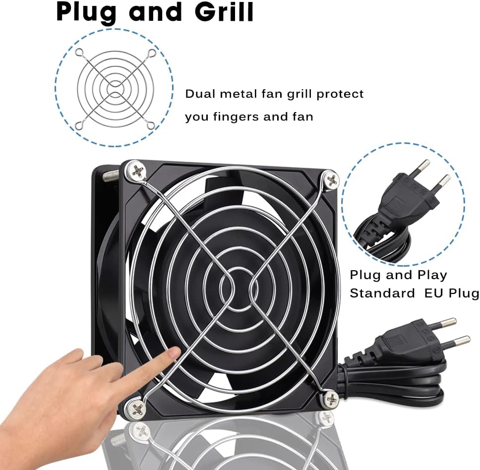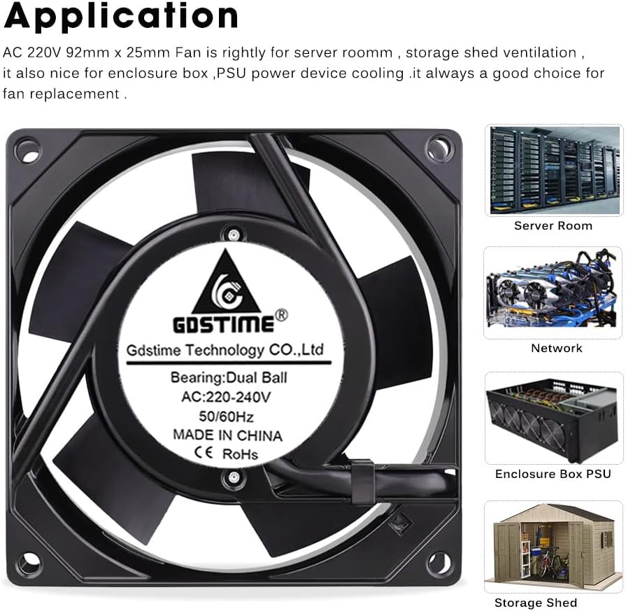 - Spezifikation: Abmessungen: 92x92x25mm / 3.62x3.62x1in ;Betriebsspannung: AC 220V-240V ; Frequenz: 50HZ-60HZ ;Geschwindigkeit: 2400RPM-2600RPM; Luftfluss: 32CFM-36CFM ; Lärm: 32dBA-34dBA ; Material: Lüfter rahmen aus Aluminium legierung, Lüfter