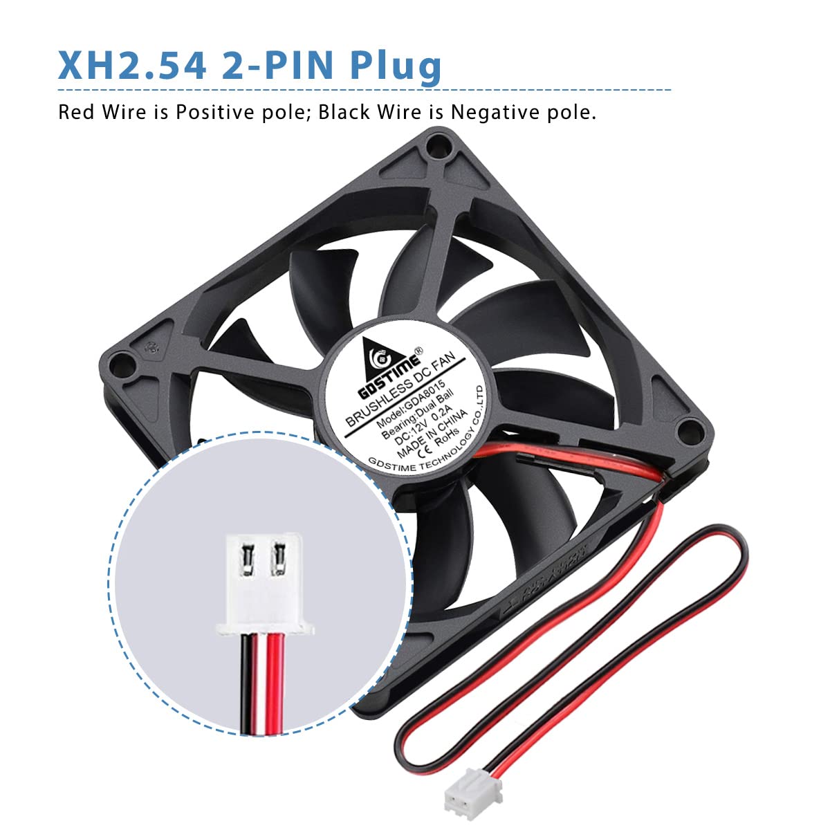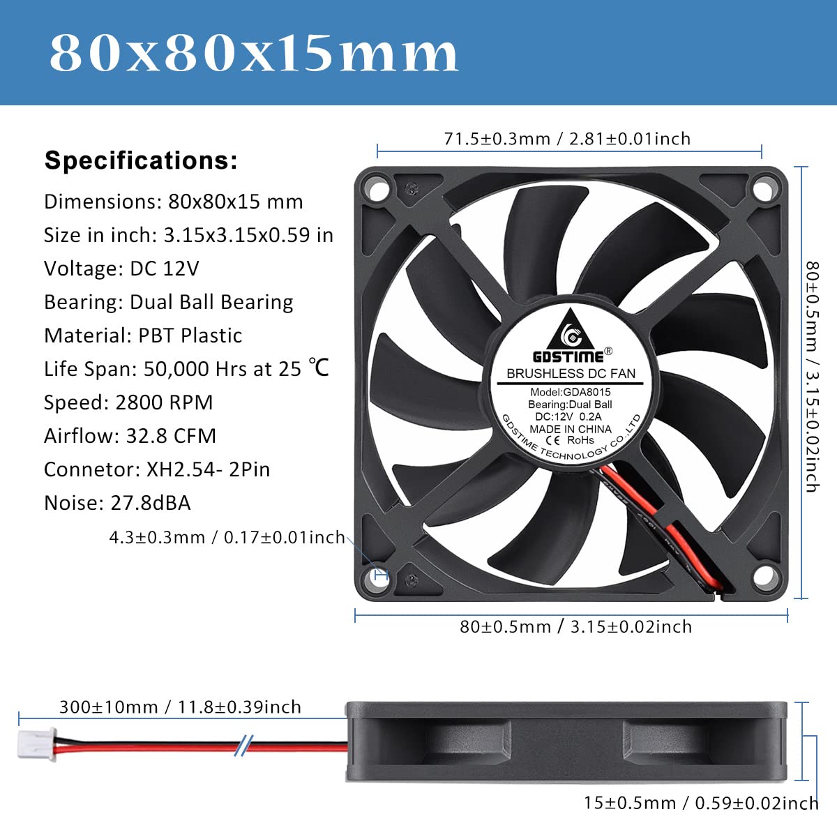 - Abmessungen: 80x80x15mm ; Stromspannung: DC 12V ; Geschwindigkeit: 2800 U/min ; Luftfluss: 32,8 CFM ; Lärm: 27,8 dBA ; Lager: Dual Kugellager ; Verbinder: XH2.54-2Pin ; Lebensdauer: 50.000 Stunden bei 25 ℃ , Material: PBT-Kunststoff-Lüfterrahmen und