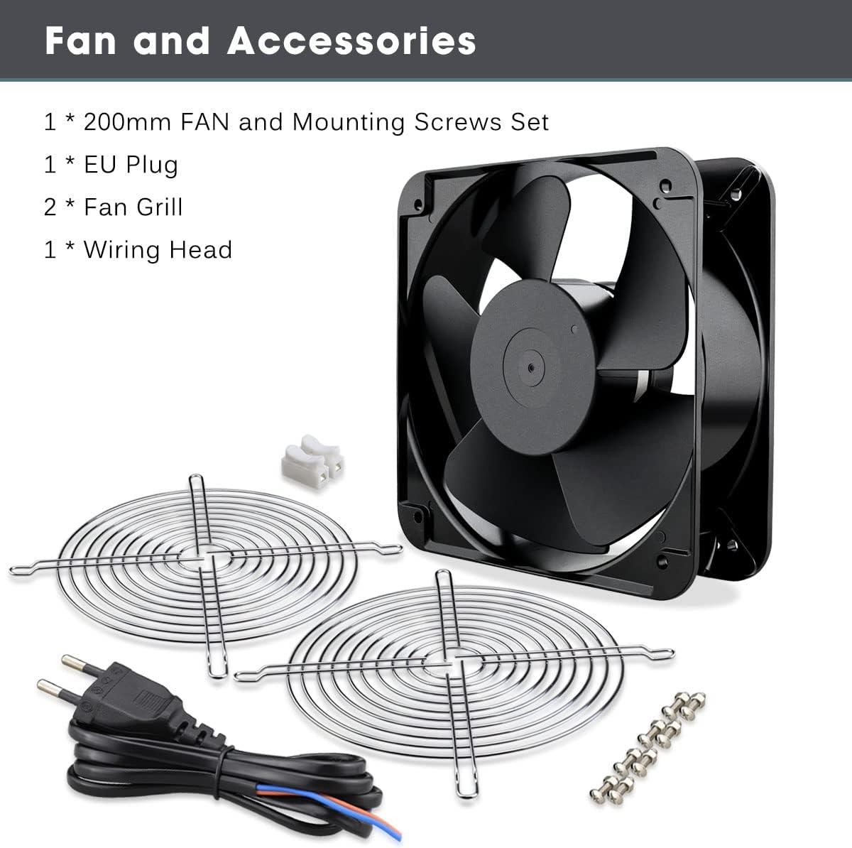 - Paketliste: 1* 200mm Lüfter ; 2*Metallgrill ; 1* EU Power Plug;1*Verdrahtungskopf ; Schraube ;