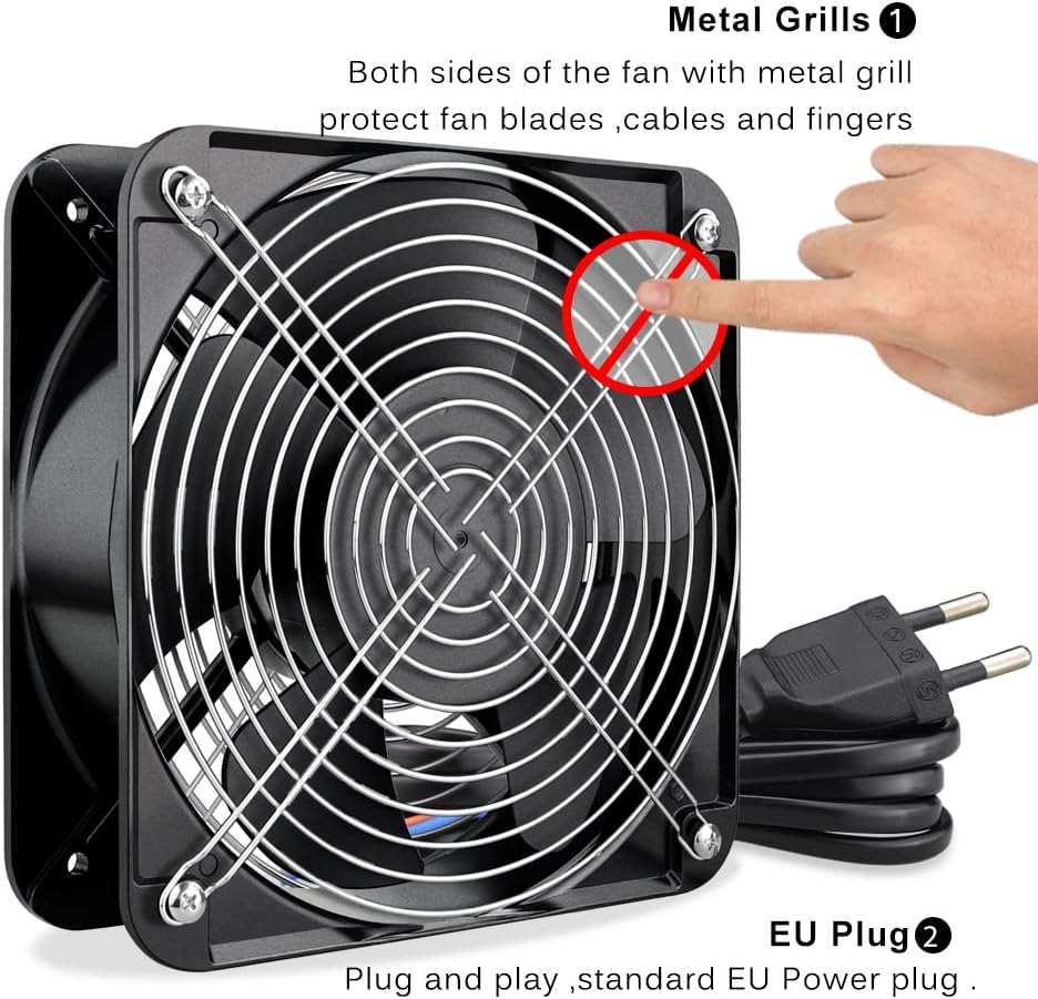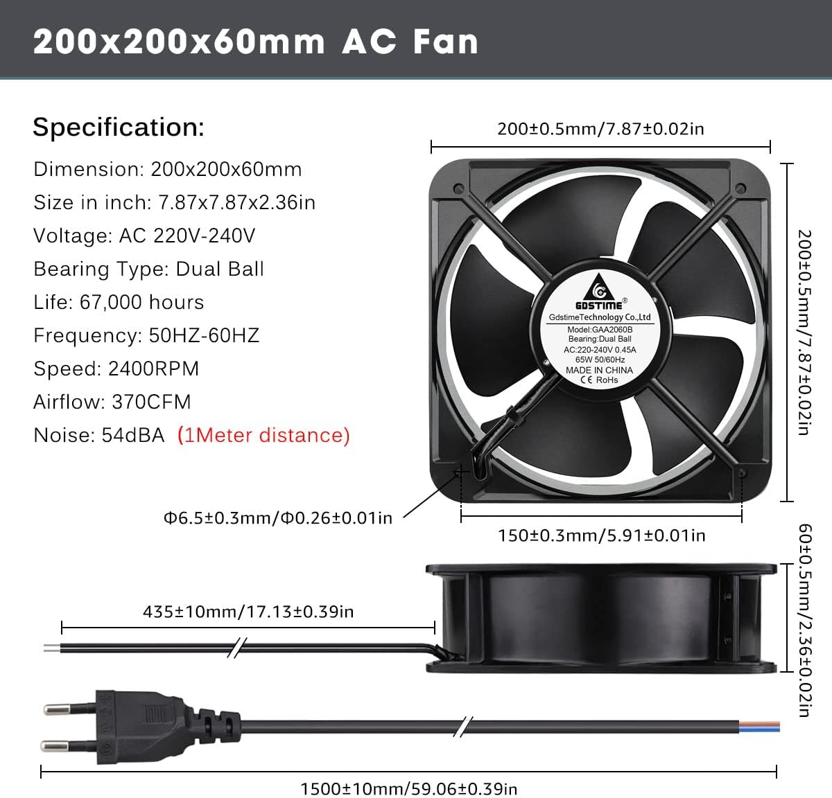 - Spezifikation: Abmessungen: 200x200x60mm / 7.87x7.87x2.36in ;Betriebsspannung: AC 220V-240V ; Frequenz: 50HZ-60HZ; Geschwindigkeit: 2400RPM; Luftfluss: 370CFM ; Lärm: 54dBA ; Material: Lüfter rahmen aus Aluminium legierung, Lüfter blätter aus