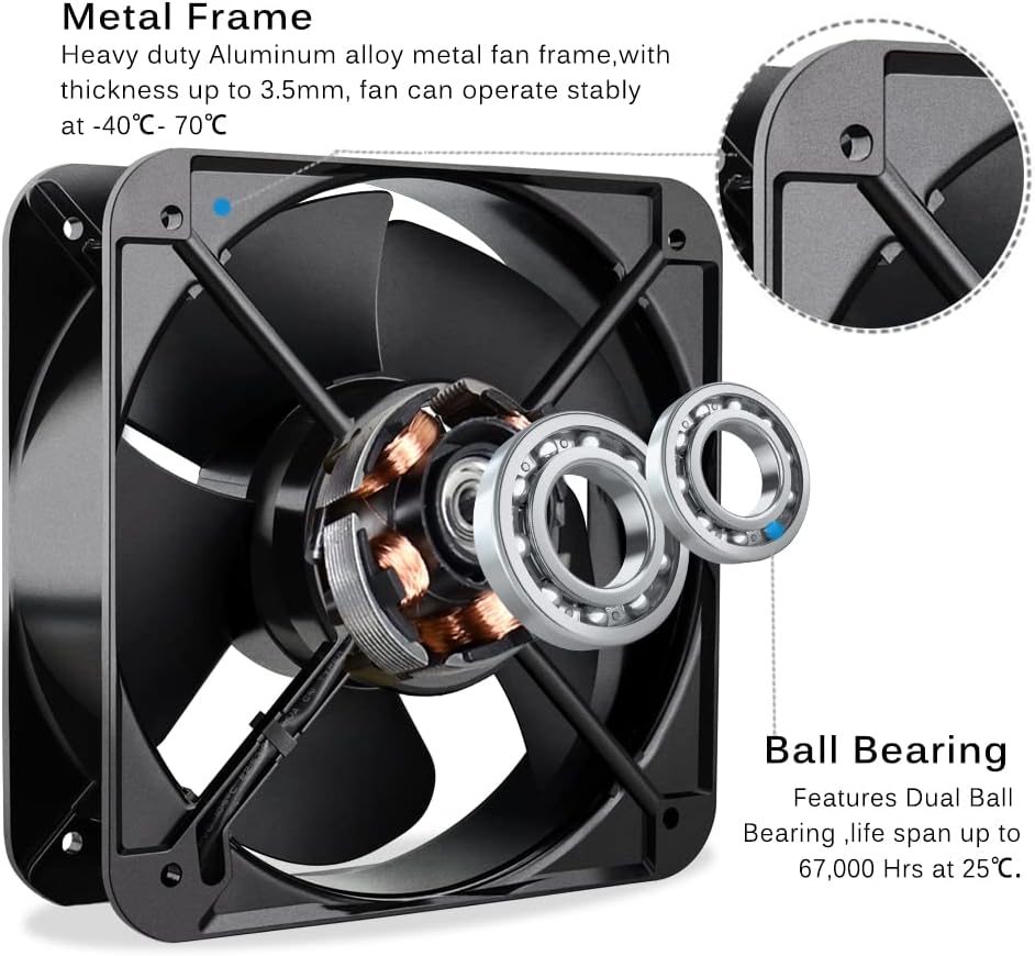 - Hoch leistungs Lüfter rahmen aus Aluminium legierung, Dicke des Lüfter rahmens beträgt bis zu 3,5 mm, 220V 200mm Lüfter kann reibungslos bei -40℃- 70℃ betrieben werden, richtig für industrielle Kühlung , Belüftung und Lüfteraustausch