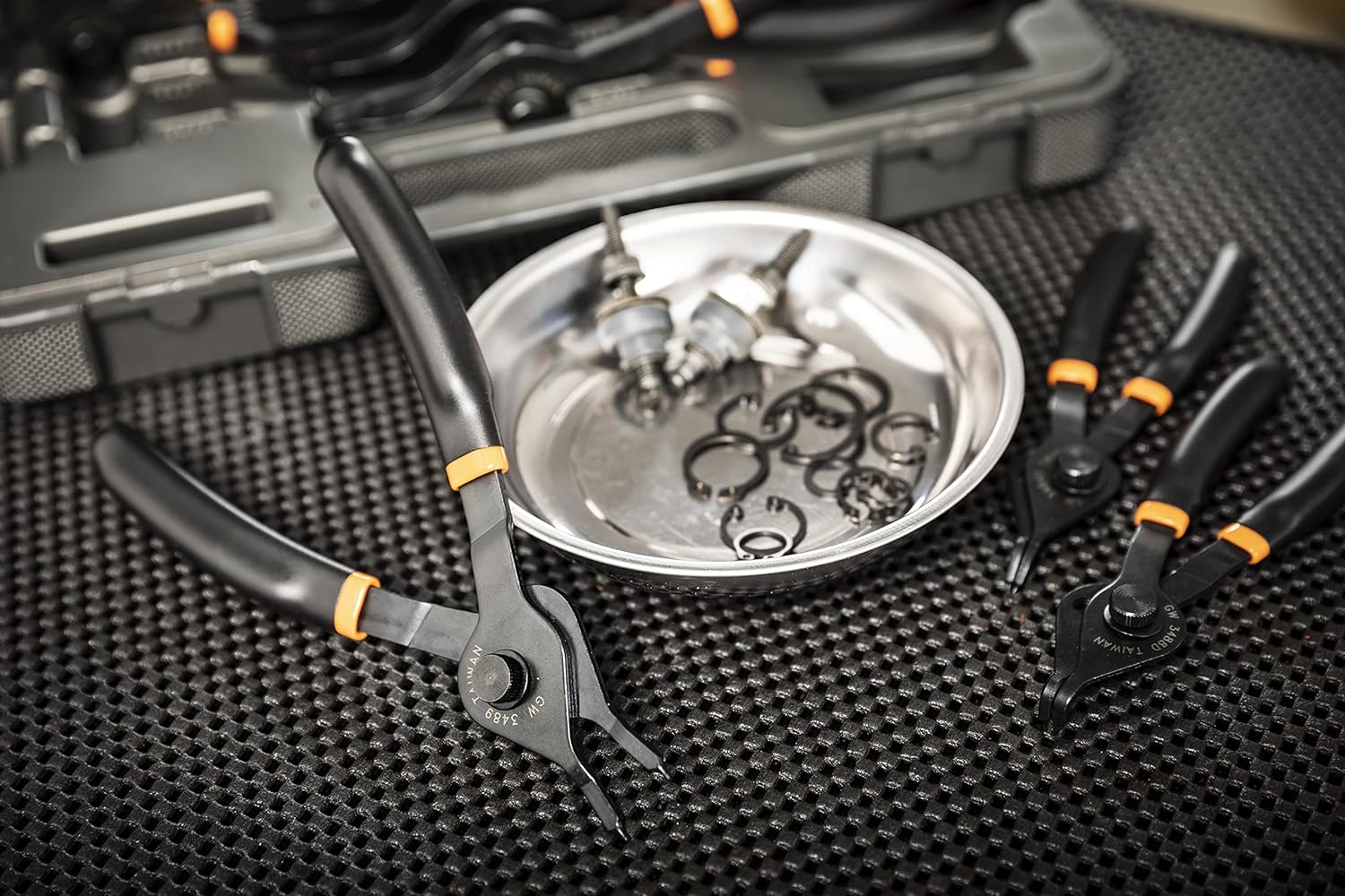 - 12-teiliges Sprengringzangen-Set entfernt und installiert entweder interne oder externe Sprengringe für eine Vielzahl von Anwendungen