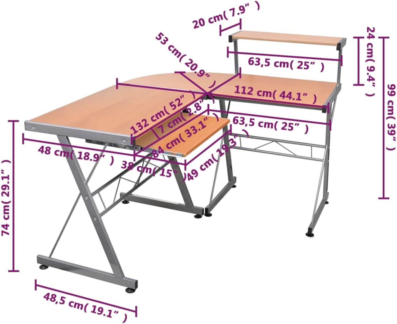 • Material: Holzwerkstoff, pulverbeschichtetes Stahl Abmessungen: 132 x 112 x 99 cm (B x T x H) Abmessungen des Schreibtisches (mit ausziehbarer Ablage): 84 x 48 x 74 cm Abmessungen des Schreibtisches (mit oberer Ablage): 63,5 x 48 x 99 cm Abmessungen der