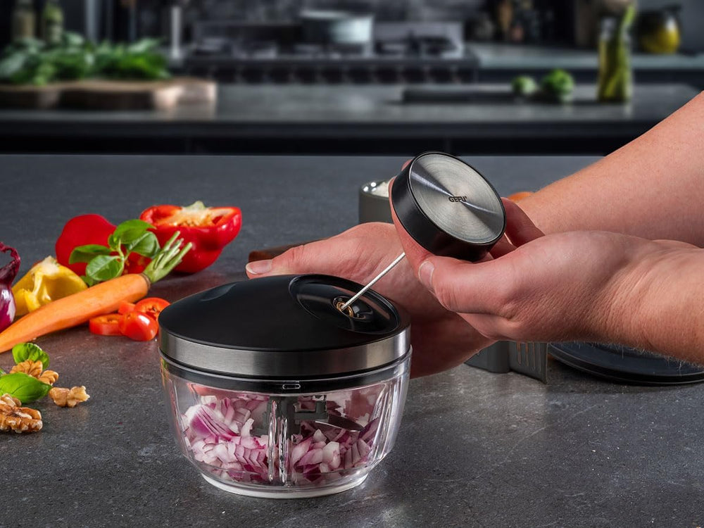 - EFFIZIENTES ZERKLEINERN: Der GEFU Multizerkleinerer ZIZO verarbeitet Obst, Gemüse, Nüsse und Kräuter mühelos – ganz ohne Strom. Der manuelle Seilzugmechanismus sorgt für präzises Schneiden und kraftsparendes Arbeiten in Sekunden
