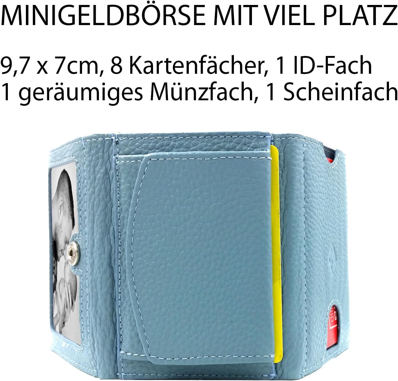 - ✓ VIEL PLATZ IN 10 FÄCHERN – Die kleine, flache aber dennoch geräumige Geldbörse besitzt 7 Kartenfächer, 1 Fach mit ID Fenster für Lieblingsfoto oder Ausweis, 1 Münzfach, 1 Geldscheinfach für alle Schein-Formate.