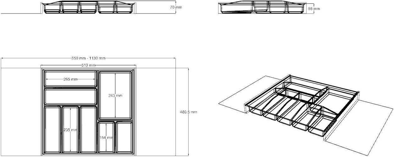• Abmessung: 480,5 mm x 510 mm. Einsetzbar für 70er bis 120er Schubladen, inkl. Antirutschboden, 2 x Abschlussleiste , 2 x Antirutschmatte 480,5 mm x 300 mm.