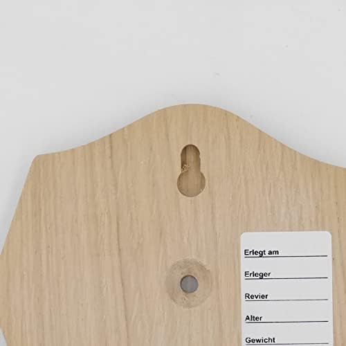 - die Rückseite: Bohrung für Gehörnklammer; Aufhängevorrichtung und Daten Aufkleber (mit möglichen Angaben zu: Erlegungstag, Erleger, Revier, Alter und Gewicht); inklusive 5 Stück Gehörnklammern zur sicheren Befestigung der Jagdtrophäe;
