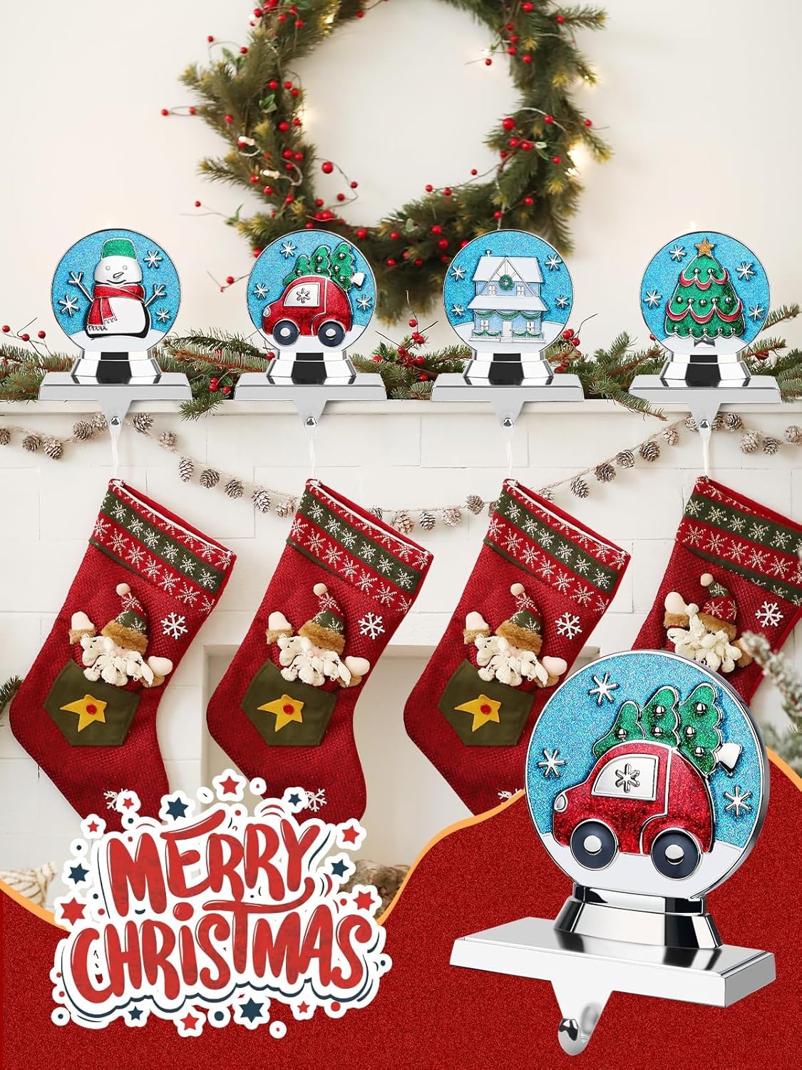• Unverzichtbare Weihnachtsdekorationen: Neue Muster für Weihnachtsstrumpfhalter. Unsere Strumpfhalter für den Kaminsims sind mit einem Haus und einem Auto gestaltet. Der bunte Teil ist mit blauem Paillettenkristall handbemalt. Diese