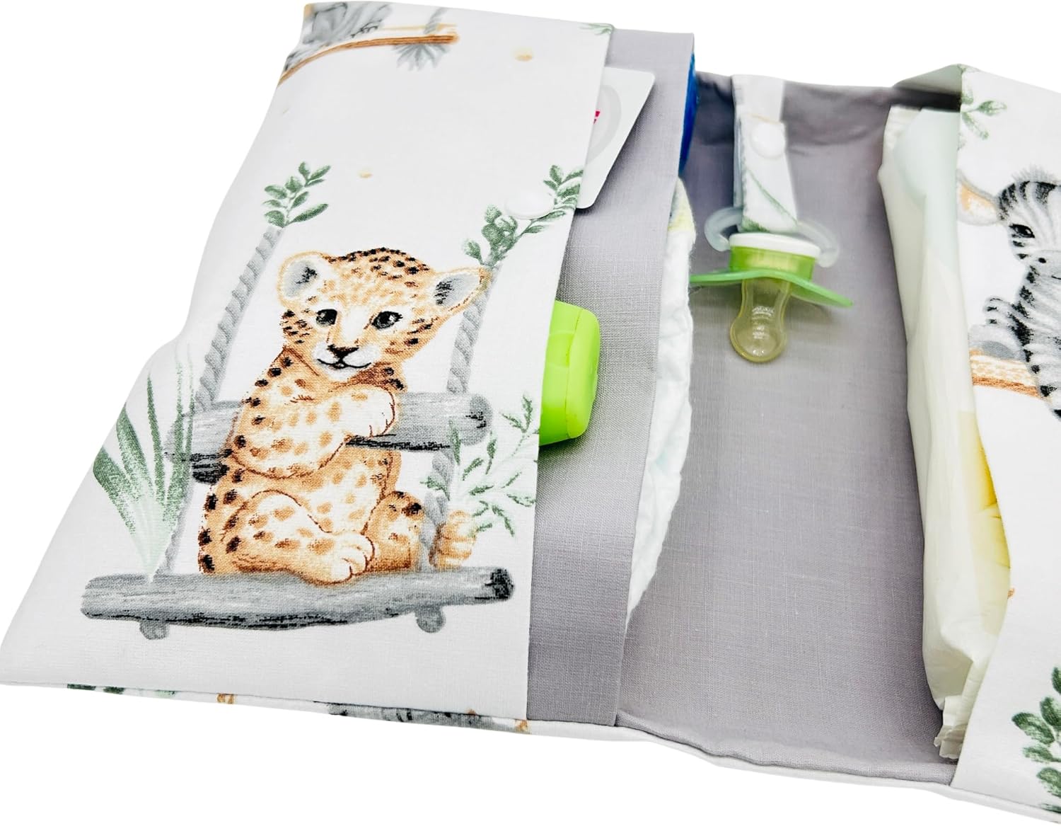- PERSONALISIERTES DESIGN: Wunderschöne Windeltasche mit niedlichem Tier-Muster, gefertigt aus hochwertigem Baumwollstoff in weiss und hellgrau, individuell personalisiert mit Name und Geburtsdatum