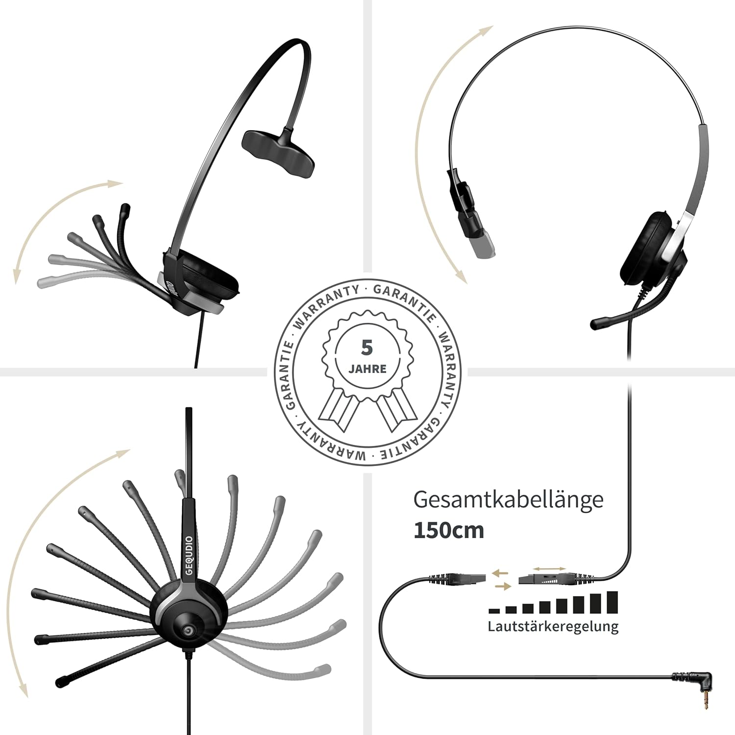 - Ein gutes Headset hat immer 2 Bügel aus leichtem Federstahl: Einer geht über den Kopf und der andere ist für die flexible Mikrofonverstellung. Nur dann ist ein Headset auch wirklich stabil und biegsam zugleich.