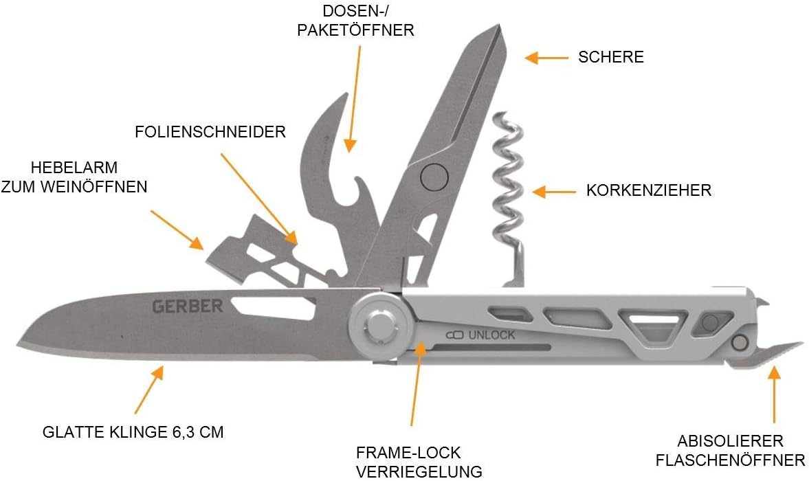 - Verstaubar in jeder Tasche dank handlichem Format, Solide Werkzeuge aus Edelstahl, Einhändiges Öffnen der Klinge möglich, Frame-Lock-Verriegelung