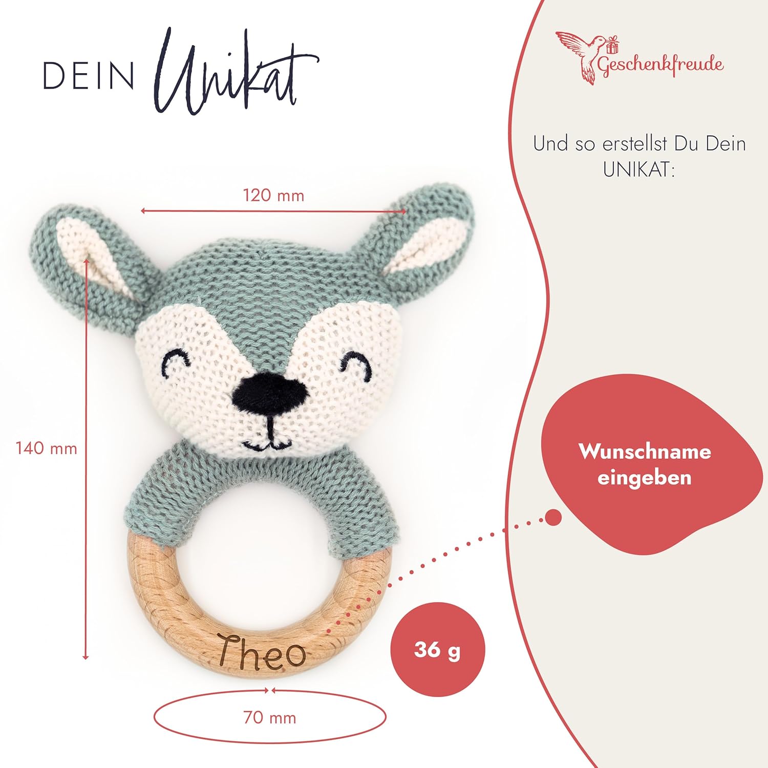 - GESCHENKIDEEN ZUR GEBURT: Der personalisierte Beissring mit Rassel eignet sich optimal als Geschenk zur Geburt für Neugeborene oder passend zum Anlass als Geschenk zur Taufe. Mache dem Baby eine Freude und lasse durch Fühlen und Greifen die Welt