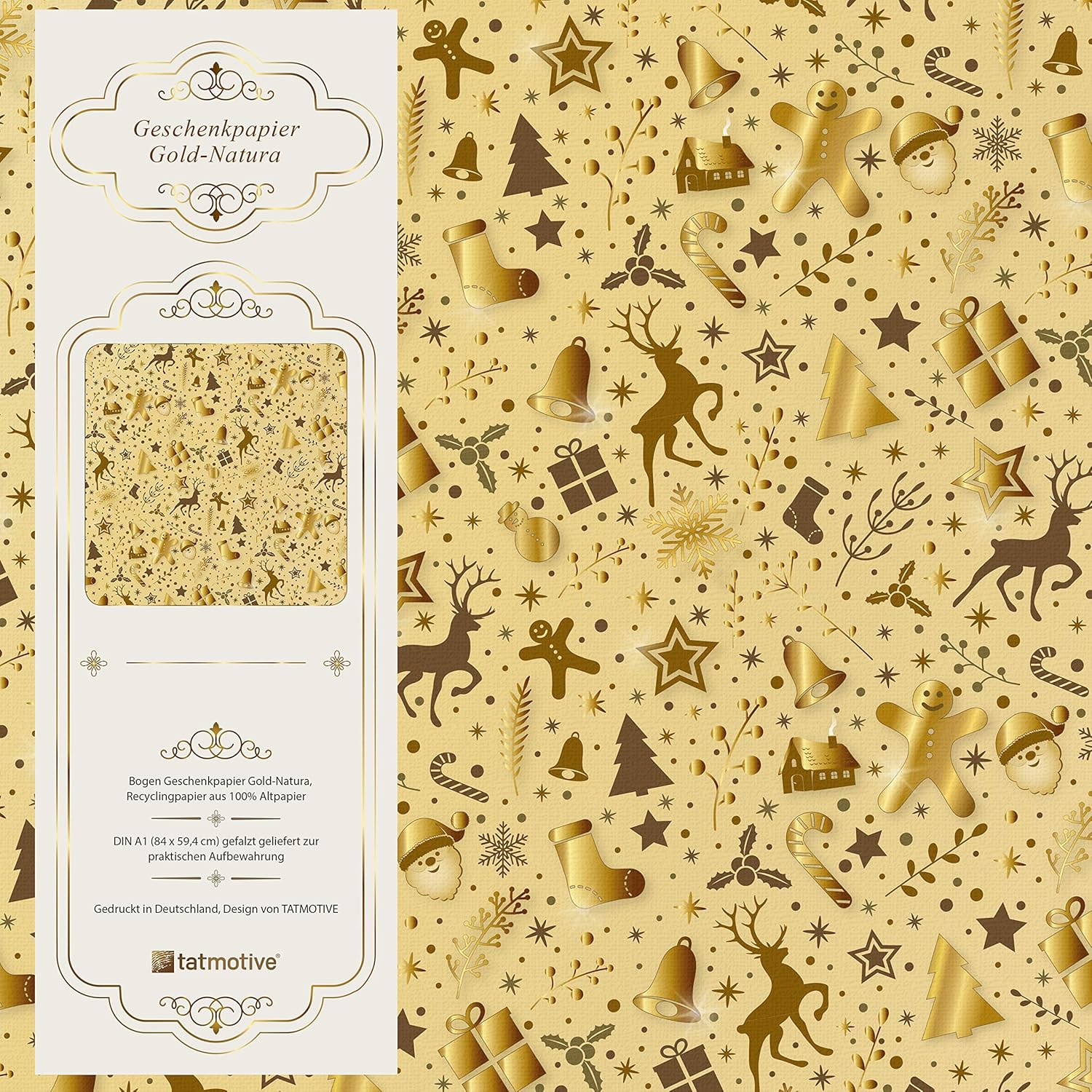 Geschenkpapier Weihnachten Gold Natura 100 Bogen 84 x 59 cm, Öko Recycling-Papier nachhaltig gedruck
