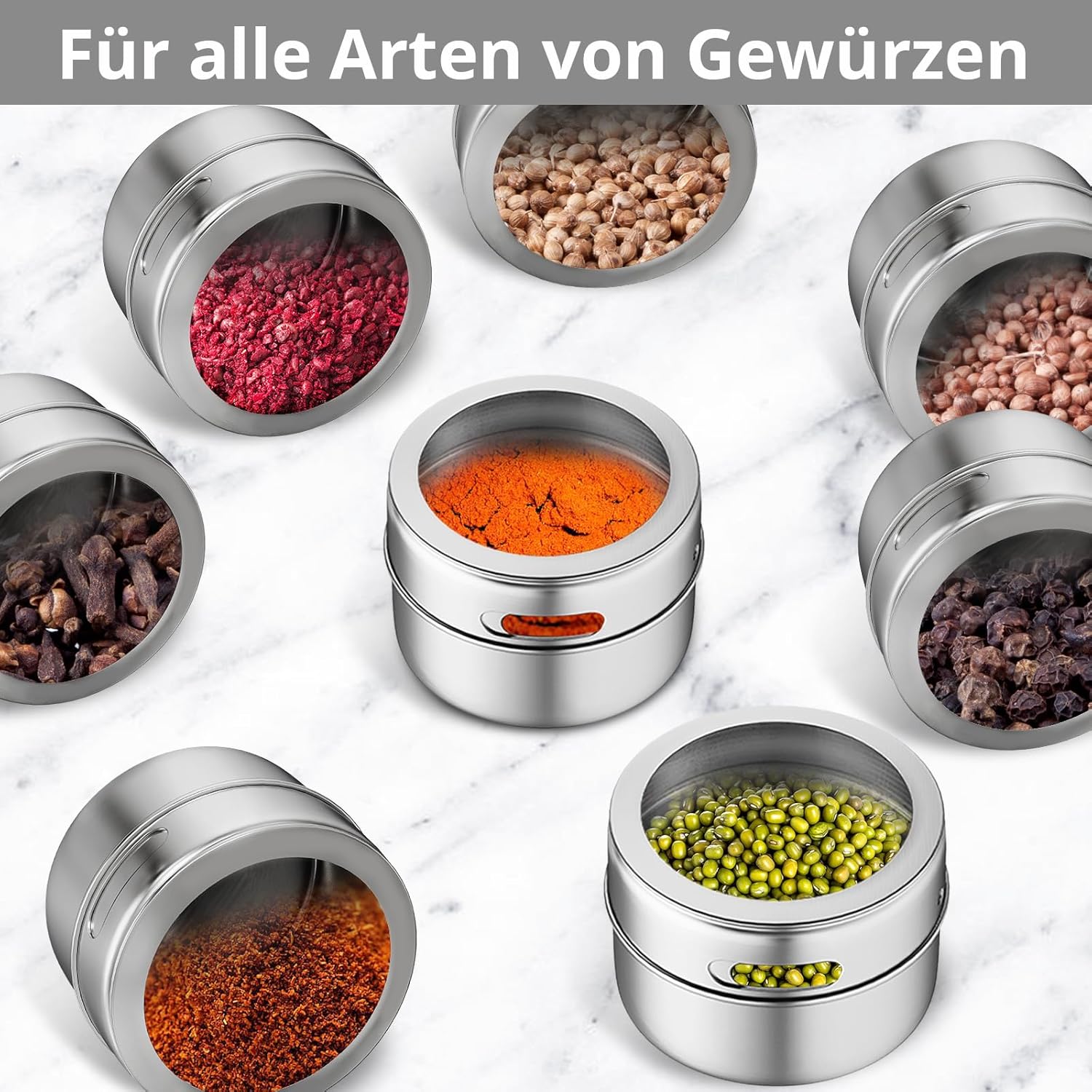 - 【Magnetisches Design】Jede Gewürzdose hat einen magnetischen Sockel an der Unterseite, so dass Sie die Gewürzdose an einer Metalloberfläche befestigen können, z. B. an einem Kühlschrank, Ofen, einer Mikrowelle usw.