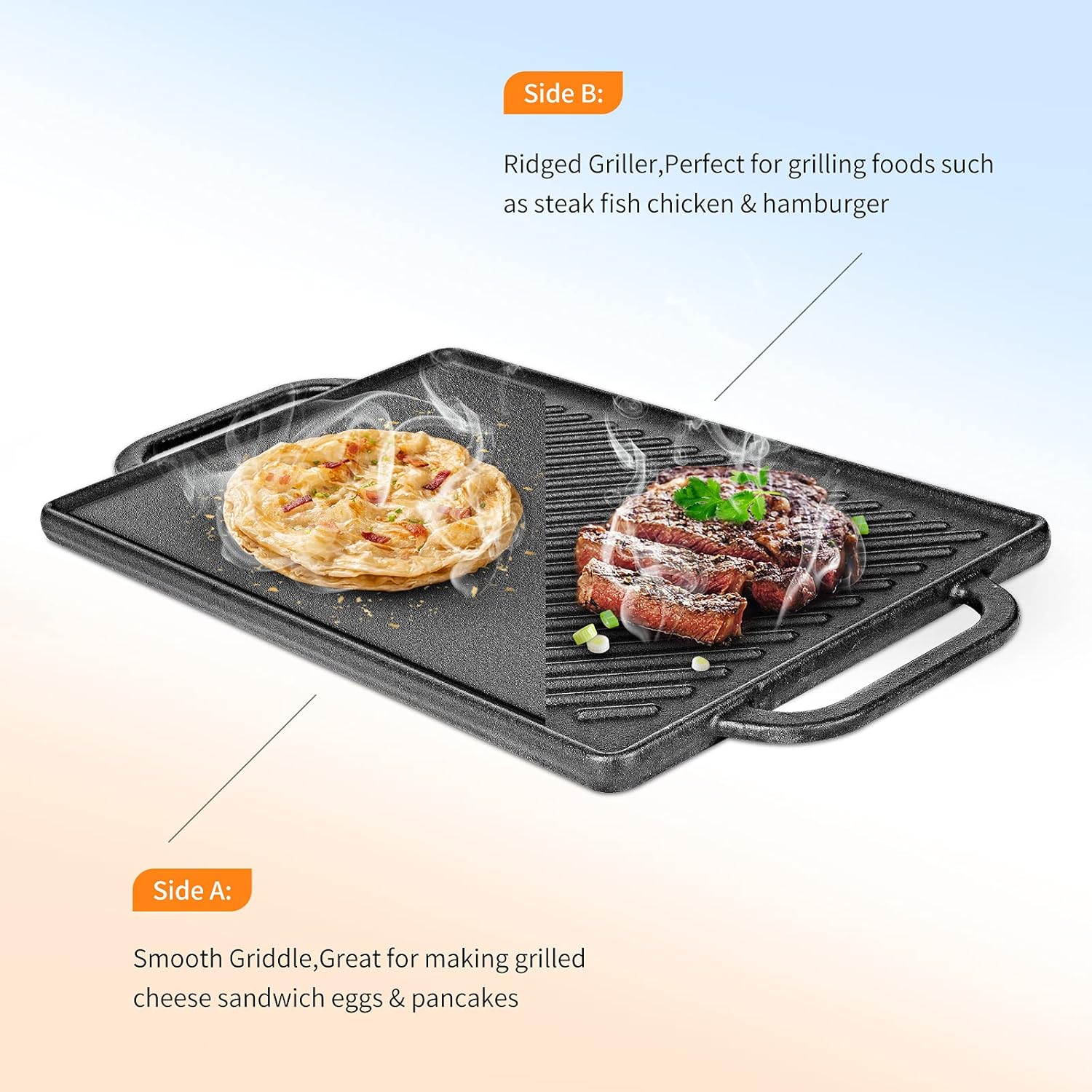 - Gesünderes Kochen: Der Grillrost verfügt über eine geriffelte Linienoberfläche, die überschüssiges Öl von Lebensmitteln fernhält und somit eine gesündere Kochmöglichkeit darstellt.Wendbare Seiten: Die glatte Seite ist ideal für die Zubereitung