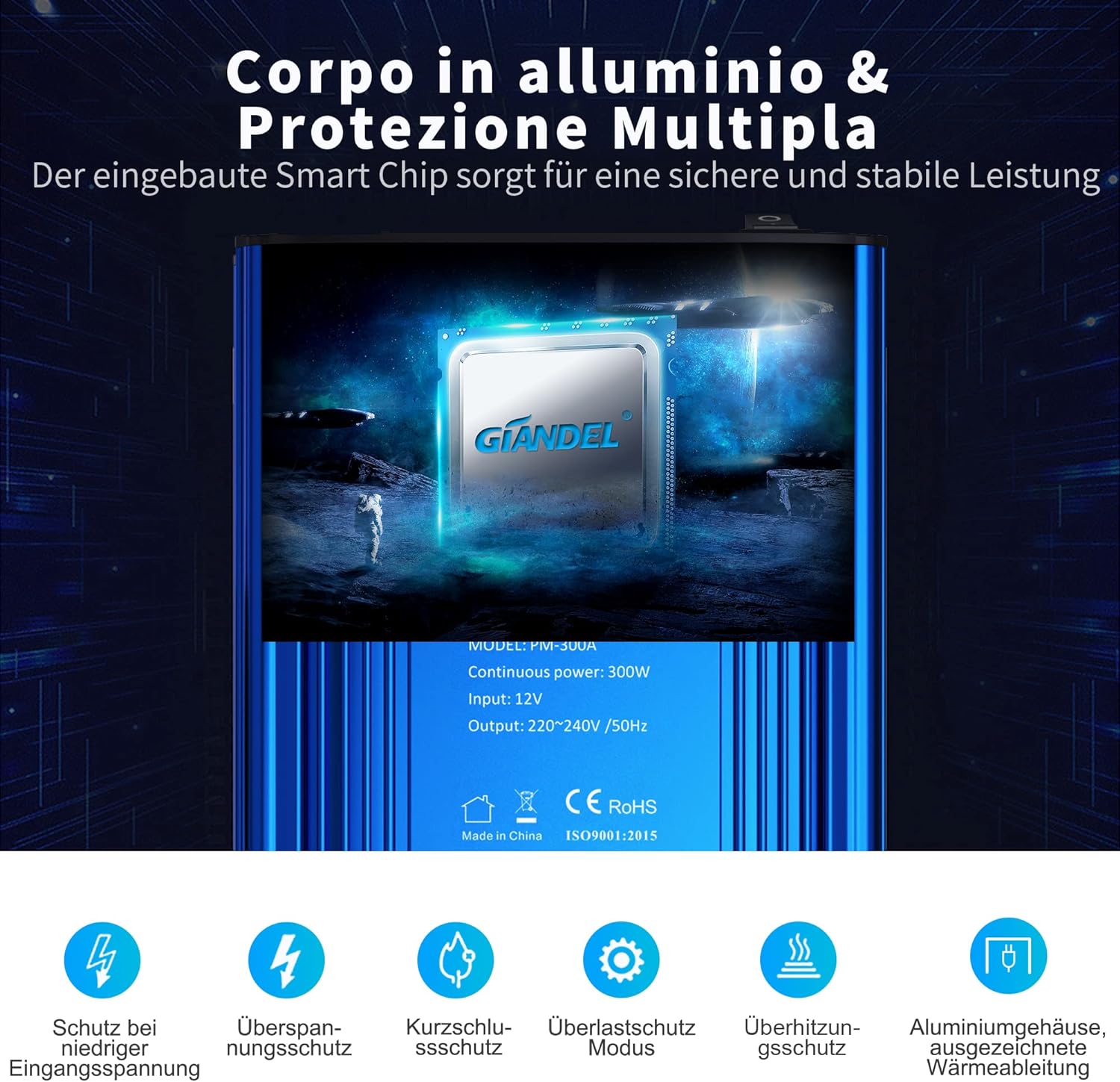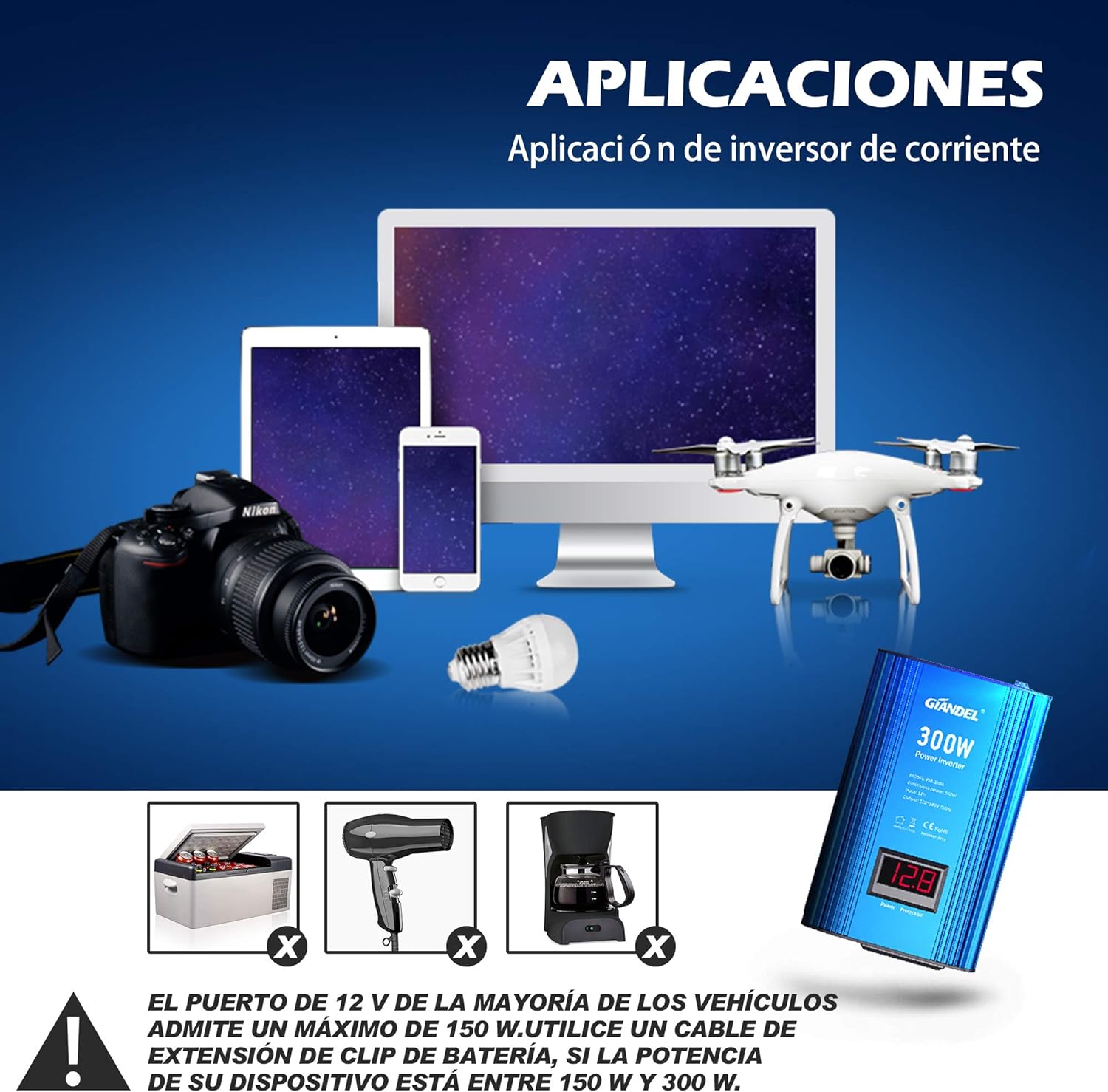 - 300W Wechselrichter 12V auf 230V: Stellt 300W Dauer-Gleichstrom-Wechselstrom zur Verfügung mit AC Universal Steckdose und 2 USB-Anschlüssen. Das Gerät verfügt über eine universal steckdose, die in den meisten Steckern erhältlich ist: europäischer