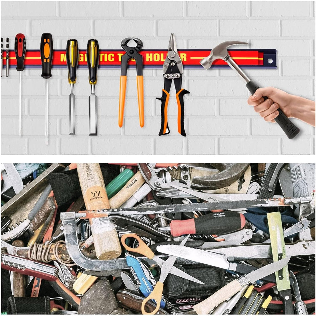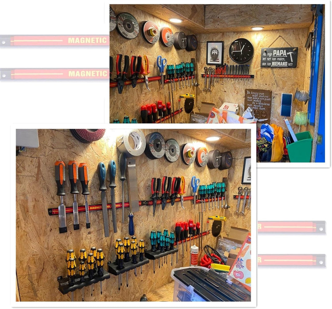 - 🛠️ Platzsparend und ordentlich - Mit den starken Magnetleisten Setkann man vielfältige metallische Werkzeuge wie Hammer, Schere, schraubenzieher fest und gut sichtbar an der Wand hängen. Schon ist weniger Chaos in der Werkstatt!