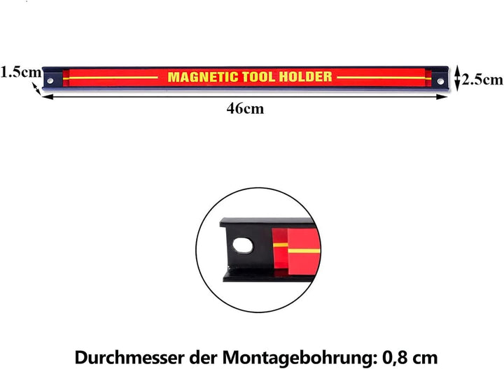 - 🛠️ Weitere Details - Jede Magnetschiene misst 46 x 2,5 cm (L x H) und wiegt ca. 0,72 kg. Der Durchmesser der Montagebohrung beträgt ca. 0,8 cm. Die Magnet Leiste ist nur auf die fronte Seite magnetisch, daher muss man sie mit Schrauben an der Wand befestigen.