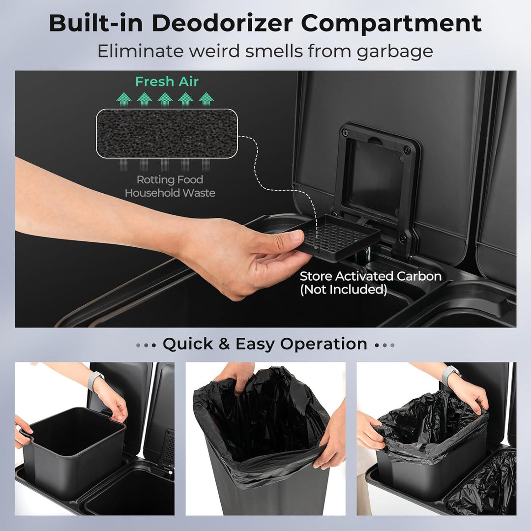 - ✨ Einfach zu bedienen - Dieser Abfalleimer hat zudem ein Haltesystem, das den Deckel geöffnet hält, damit Sie genügend Zeit haben, Abfälle zu entsorgen und zu reinigen. Zusätzlich verfügt der Mülleimer über 2 integrierte Desodorierungsfächer,