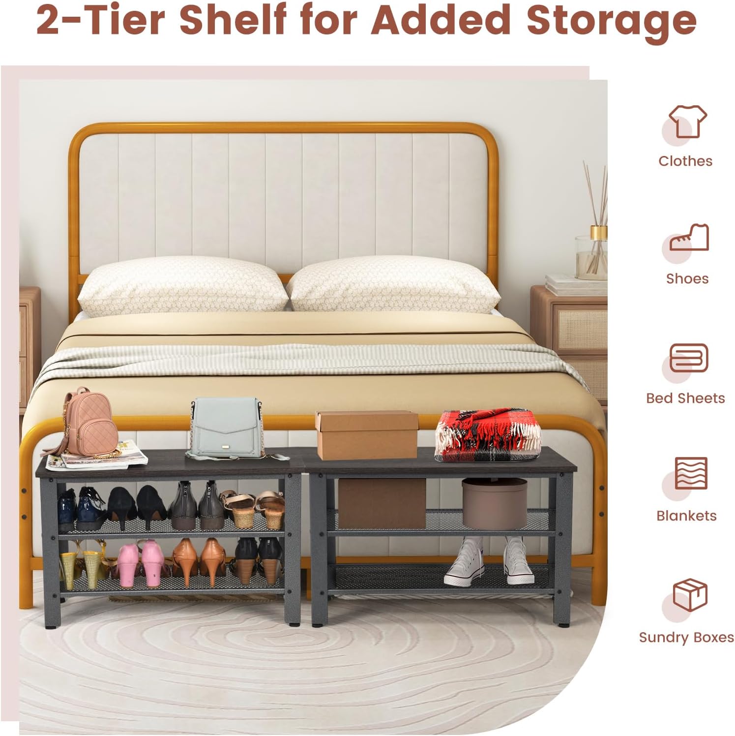 - 💝 Gitterablagen für Luftzirkulation - Die 2 offenen Ablagen der Schuhbank bestehen aus rostfreiem Metallgeflecht, was die Luftzirkulation erleichtert und so für eine optimale Aufbewahrungsumgebung für Schuhe sorgt. Die Massivholzplatte sorgt für