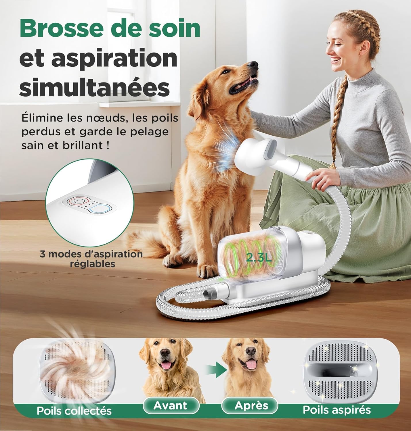 - [Einfach zu Bedienen & Flexibel] Die einfache Installation und der Austausch der Düsen sowie der abnehmbare Staubbehälter erleichtern die Reinigung. Ein 1,4m verlängerbarer Schlauch und ein 2,3m Netzkabel ermöglichen flexibles Grooming an jedem Ort.