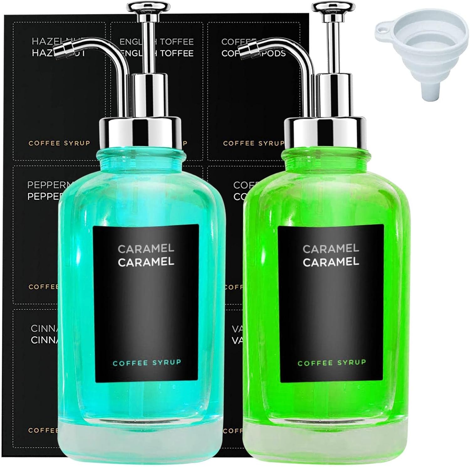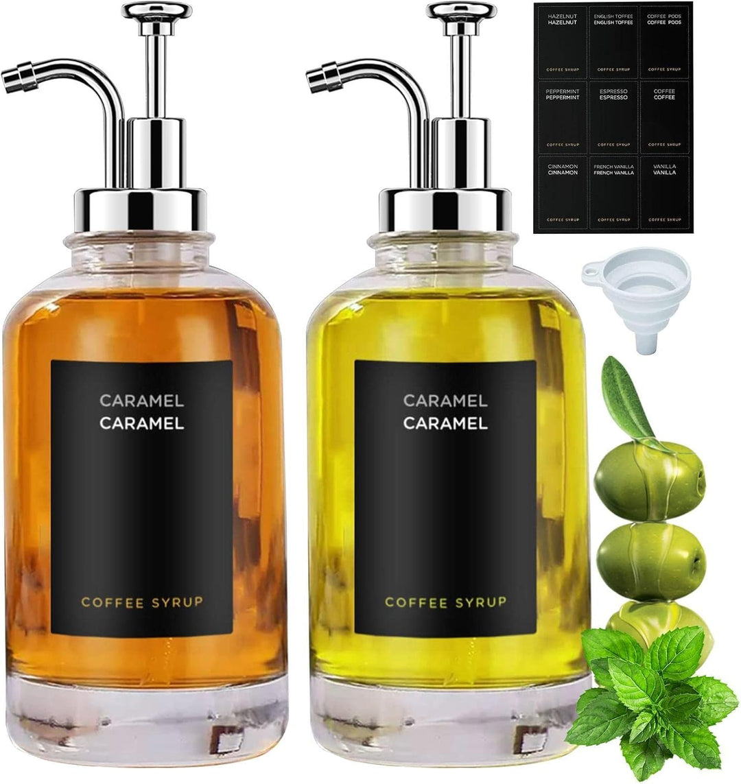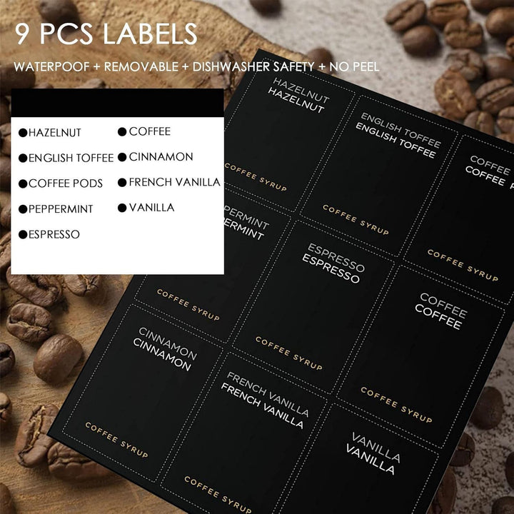 - Minimalistische Etiketten: Kaffeesirupflaschen enthalten zwei Pumpen im Industriestil, einen Trichter und ein Set minimalistischer Etiketten. Es hilft, Ihre Kaffeebar-Essentials zu organisieren.